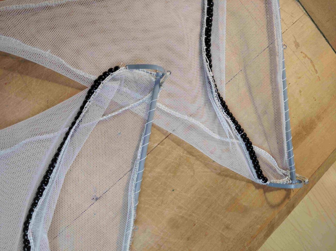 Z plánu jsem si zkopíroval šablony sítě na silnější karton a podle šablon z tylu vystříhal díly sítí. Na sešití jsem použil po obvodu sítě lněnou niť tloušťky 0,7 mm a vlastní šití je lněnou nití 0,3 mm. U role sítě (část jdoucí po dně moře) jsem nahradil dřevěné válečky ze stavebnice černými korálky z manželčiných zásob. Navlečeny jsou na řetízek ze stavebnice.
