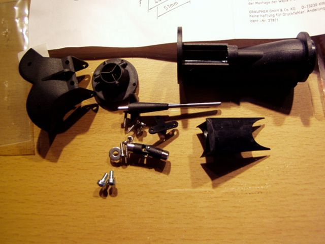 - samotné jety jsou přesné výlisky z plastu, se zalisovanými kluznými pouzdry pro hřídel turbínky + podložka M3 fungující vzadu jako axiální ložisko. V zadním čele je nacvaklá směrová tryska a přišroubován obraceč tahu. Protože jsem se bál páčku lepit na sestavené trysce, kde hrozí realné nebezpečí zalepení čepu otáčení, jenž jí prochází, páčku jsem oproti návodu nejdříve přilepil vteřinovým lepidlem. A až poté za mírného a opatrného použití síly a jemné deformace směrové trysky nacvakl do zadního čela. Při sestavení kardanů je třeba opatrnosti, aby nevyskočil spojující kříž uprostřed. Díry mají udělané náběhy takže tam kříž pěkně skočí. Samotný kardan je proveden precizně a vypadá i odolně. Před sestavením jsem ještě jemně ořezal a obrousil na dvoulistých turbinkách mírné otřepy. Turbínky mají nerezovou 3mm osu.