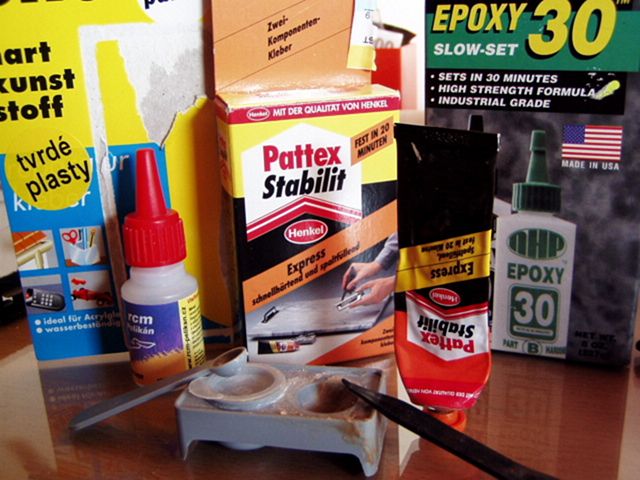 - překližka, ABS, nerez, hliník, guma, okna, plast - vteřinové lepidlo + aktivátor (opatrně, na plastu muže zanechat fleky)