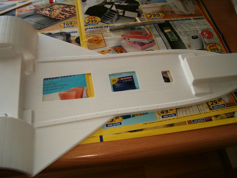 modelu tak vychází moc vysoko a trup s rovným dnem je velmi nestabilní. Hned na místě jsem provizorně prořízl kapsu