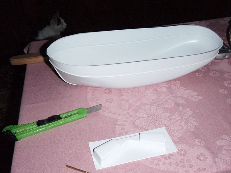 První věc byla, obstřihnout trup nůžkami podle návodu. Bylo to o pevné ruce. Pak jsem do trupu vyvrtal díru a zalepil hřídel epoxidovým lepidlem. Po vytvrdnutí jsem našrouboval šroub a skusil sílu motoru. Do trupu jsem zalepil dřevěný nosník na který jsem pak přišrouboval servo. Zvolil jsem Hs-311.