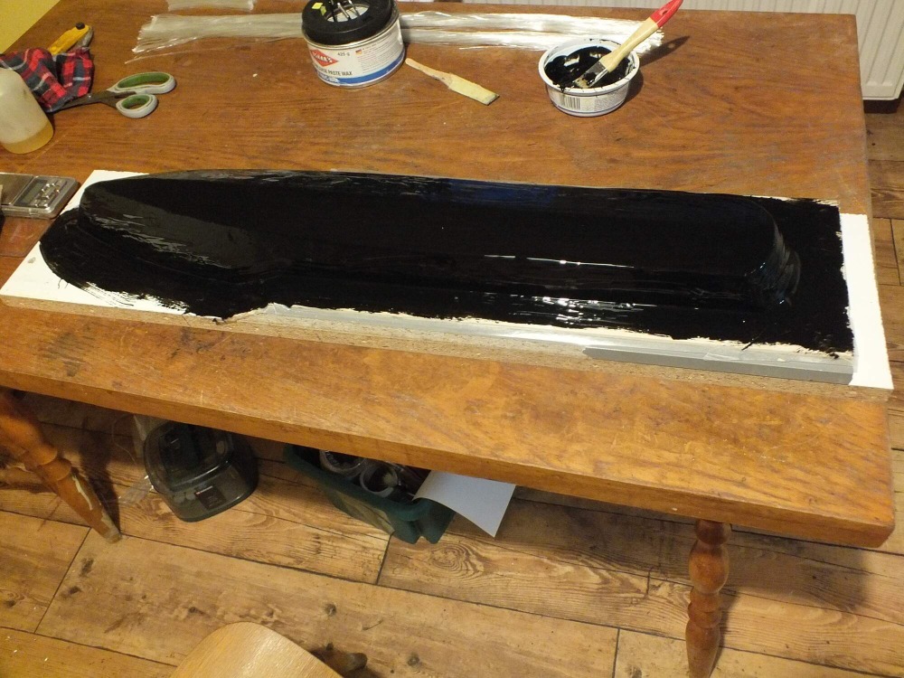 A teď k vlastní výrobě formy. První vrstvu tvoří epoxidový gelcoat na výrobu forem F 200. Je to taková hustá, černá hmota, musíte si dát pozor na bublinky, hlavně na hranách. Gelcoat nanáším zlehka štětcem, abych nepoškrábal PVA ve vrstvě cca 3mm. Jak je ještě měkký, ale už nelepí na prsty, nanesu epoxid zahuštěný aerosolem. Zarovná tahy štětcem v gelcoatu. Na ostré přechody dám předem nastříhaný skelný roving. Zaoblí hrany mezi kopytem a deskou.