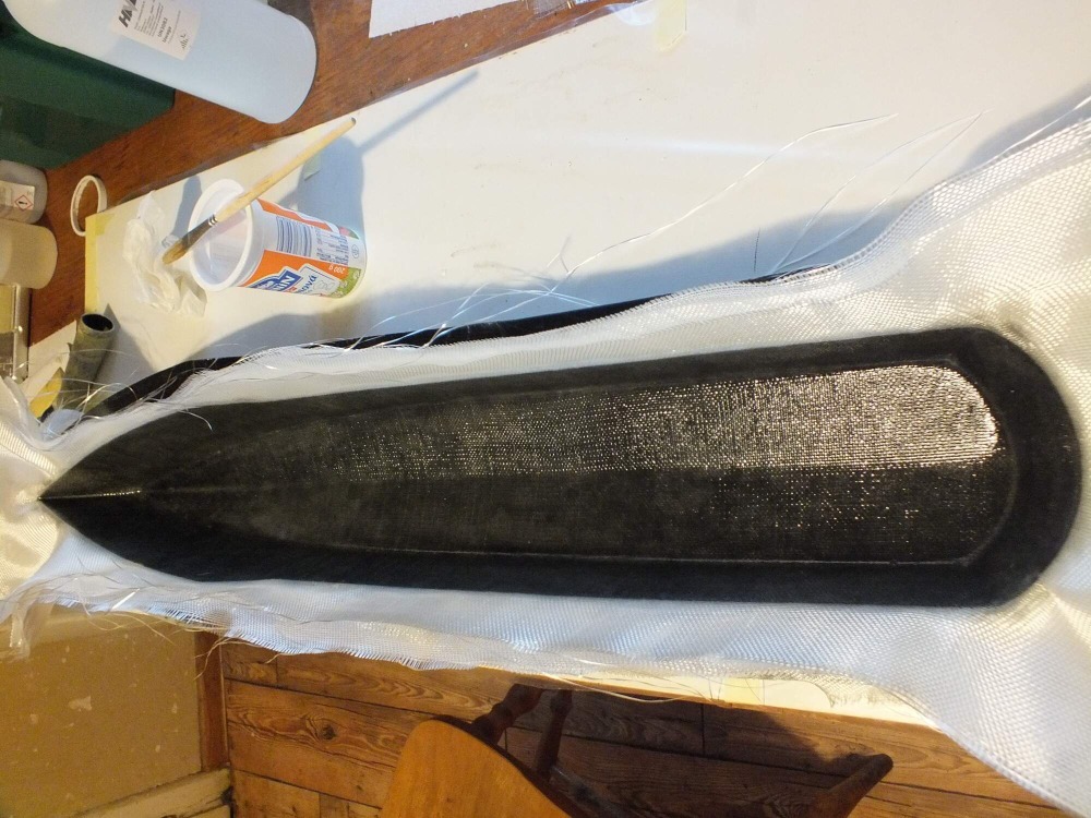 První dvě vrstvy skelné tkaniny jsou 50g, pak dvě vrstvy 80g a 160g, potom 10 vrstev 280g a nakonec jedna vrstva 160g. Mezi to je dobré dát zbytky a ústřižky tkanin různé gramáže, co se vám v dílně povalují a bylo škoda je vyhodit. Na laminování používám epoxid LH 160 a tužidlo H 146 s dobou zpracovatelností 60 minut. Je čas na práci a netuhne vám to pod rukama! Pryskyřici nanáším molitanovým válečkem, větší plochy a kde se nedostanu štětcem. Nakonec to projedu rýhovaným válečkem, abych odstranil případné vzduchové bubliny.
