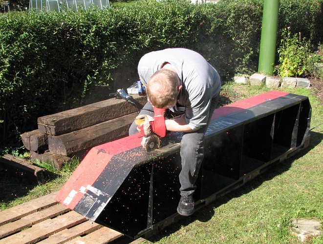 To co následovalo se dá jen těžko popsat. Bruska nepřetržite řvala cca dalších 6 hodin s vyjímkou oběda (bramborový guláš s chlebem). Její řev byl zesilován rezonujícím dvojkou plechem, ze kterého je celý trup svařen. Ante řezal a řezal a kotouče mizely a mizely. Nejdříve byl Velký Kačer obříznut po svém obvodu. Následně rozebrán a snížili jsme mu vnitřní přepážky. Experimentálně jsme ověřili, že když trefíte svár, brusného kotouče během pikosekundy ubude zhruba o jednu polovinu, ta druhá polovina v druhé pikosekundě zasáhne opodál stojícího Nexe. Pak byl Velký Kačer opětovně smontován a spasován. Opětovně rozebrán a postupně pomocí pracovních nástrojů rozbruska - pilník - smirkový papír, jsme zabrousili všechny hrany.