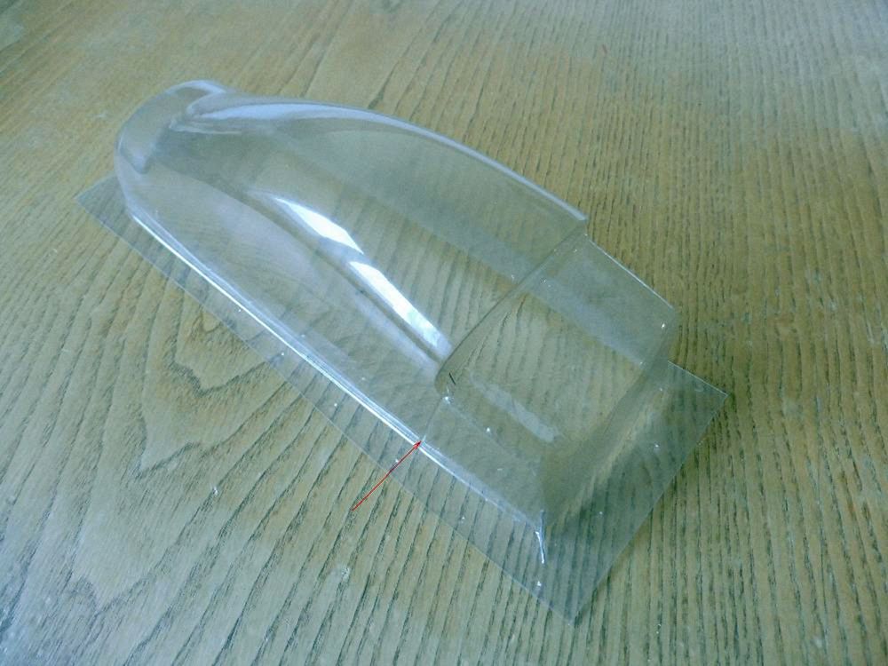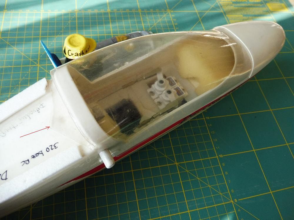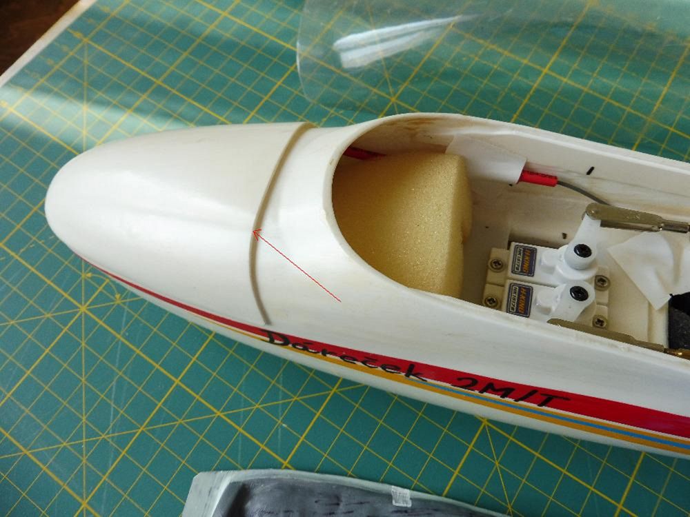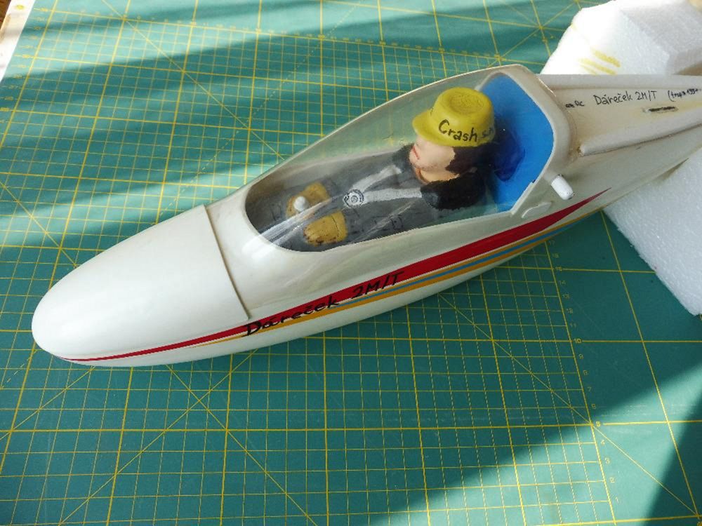 Šipka míří na překryt špičky, pod který se zasune překryt kabiny. Překryt byl vylisován s pomocí nánosu vosku na výlisek trupu, sejmutím negativu, odlitím kopyta a následně vytažen z PSH 1 mm. Po smrštění PSH to vyšlo zrovna akorát na zasunutí překrytu tl. asi 0,4 mm. Uvnitř kokpitu je vidět střední díl, který nese serva, přijímač a akumulátor a současně spojuje slepením spodní a vrchní díl trupu, dělící rovinu skrývá ozdoba ze samolepicí folie. Celkem je na fotografii sestava z 10 různých výlisků.