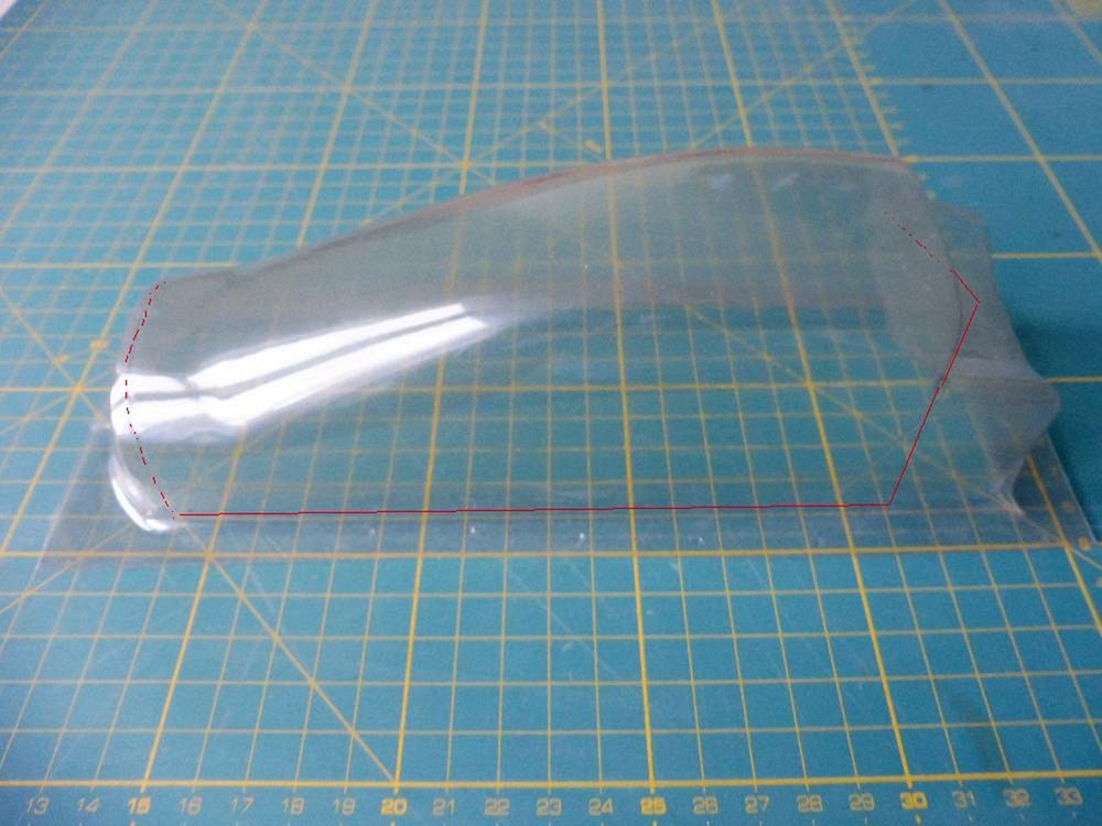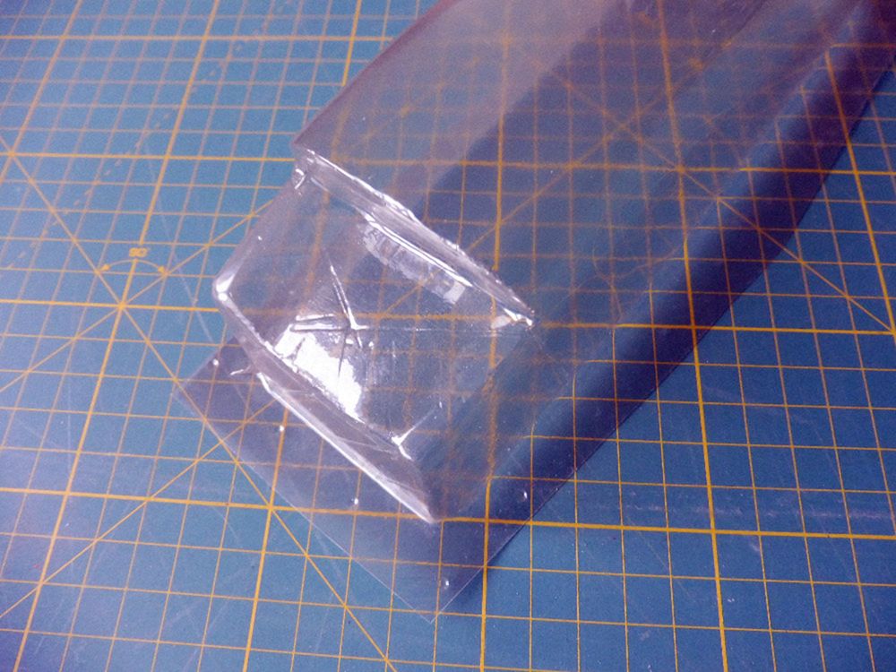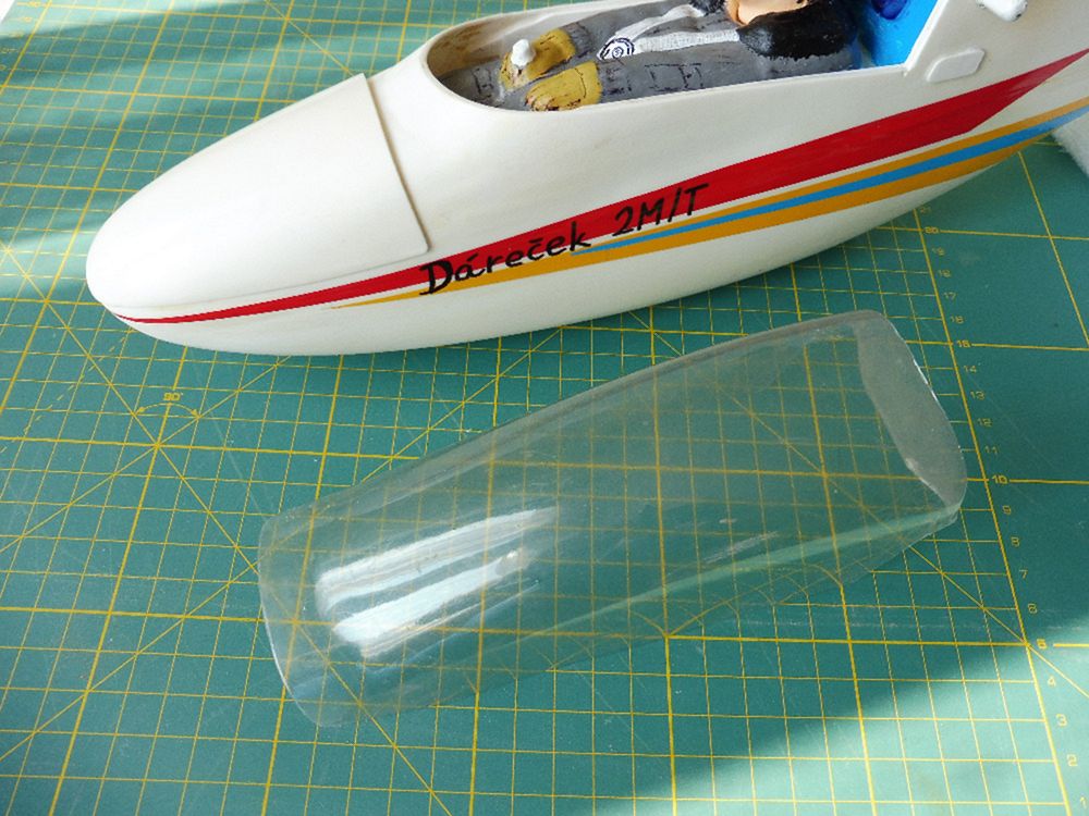Podobný postup byl použit pro výrobu kopyta kabiny větroně Dáreček, viz foto v předchozím článku - negativní forma byla sejmuta až z výlisku trupové gondoly z PSH tloušťky 2 mm, kde byla oblast kabiny vytvořena vcelku s trupem na balsovém kopytu a pak dodatečně vytvořením negativní formy odlito kopyto kabiny a následně nalícovaná kabina vytažená z Durofolu tl. 0,5 mm (svislé stěny kabiny po vytažení cca 0,3 mm). Potom byl kokpit odříznut z výlisku gondoly a pro překrytí sloužila vylisovaná kabina.