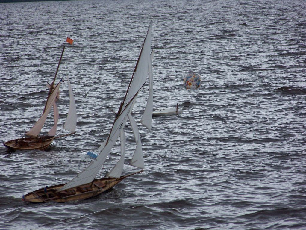 Pokud v pátek bylo ošklivě, tak v sobotu přímo děsně. Déšť se umoudřil až kolem poledne, aby kolem druhé začal foukat vítr krátce před soutěžní jízdou. Jeho síla lámala stěžně a vlny zalévaly modely. Aby toho nebylo málo, tak v polovině jízdy se přidal déšť. Po jízdě jako naschvál ustal a už to vypadalo, že dojde na další jízdu. Leč padla mlha, že nebylo vidět ani na vrcholovou bójku vytyčeného trojúhelníku. V duchu jsem si pomyslel, že by konečně vyniklo osvětlení, kterým jsou některé plachetnice vybavené.