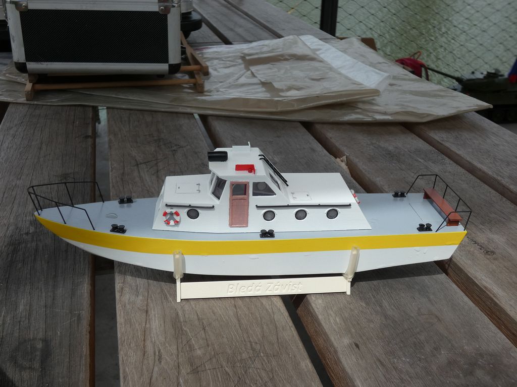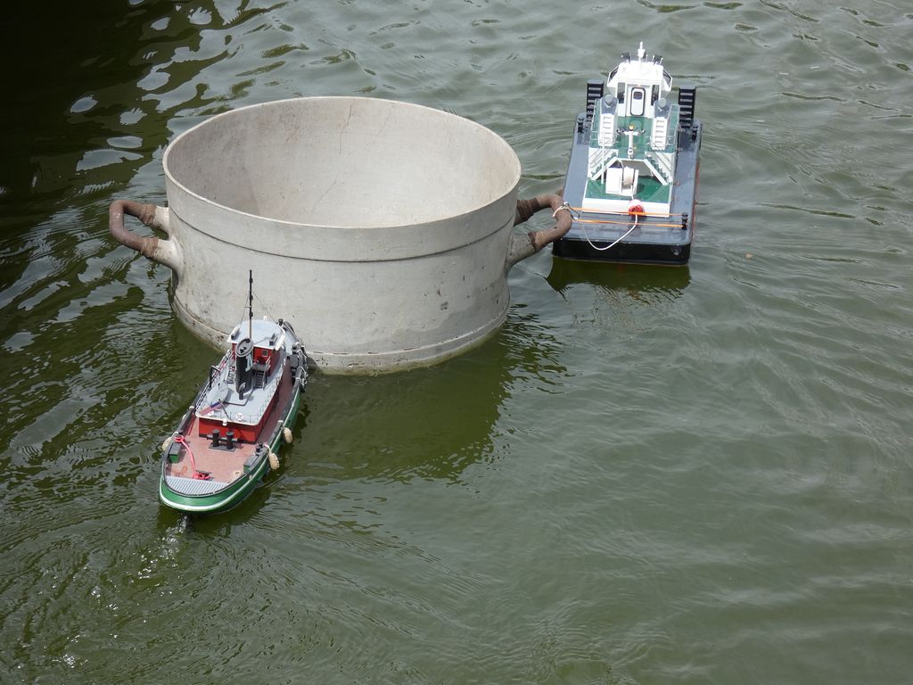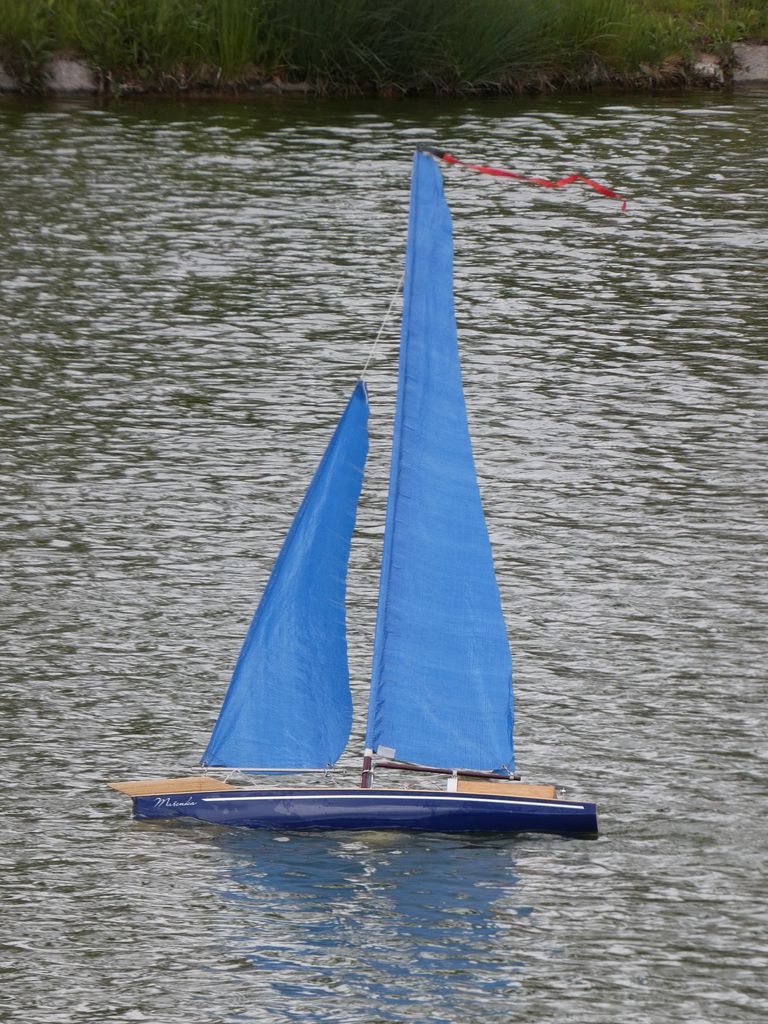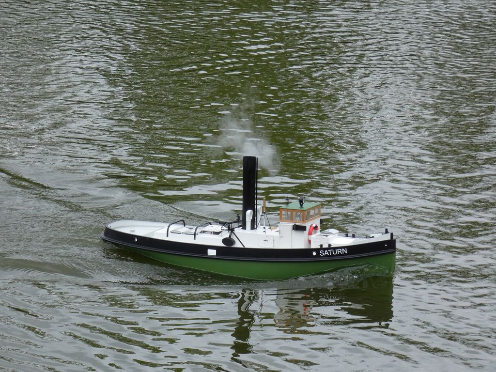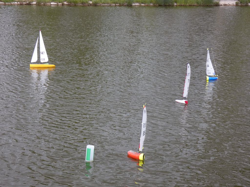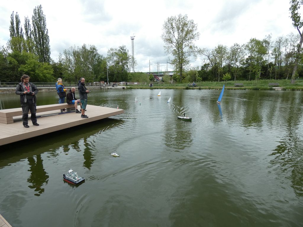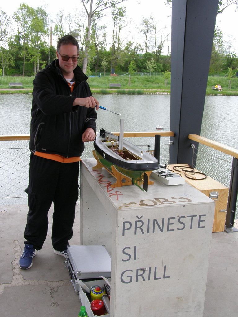 Sraz přilákal spoustu tradičních účastníků a též nové tváře. Z přítomných modelů se nedala přehlédnout kontejnerová loď Jiřího Čelikovského a nedávno popsaný Scharnhorst Vojty Tomka. Dada po delším čase provětral Nachi. Sám jsem přivezl parník Saturn, abych ho letos poprvé projel, což se podařilo. A také plachetnici Footy. Plachetnic bylo k vidění více. Jakmile Vojta Kuchta do vody rozmístil pár bójek pro Tug Towing s hrncem, měly plachetnice kolem čeho jezdit. TomasC přišel jak s Footynou, tak se po břehu proháněl s tankem, resp. tank přenechal mladším.