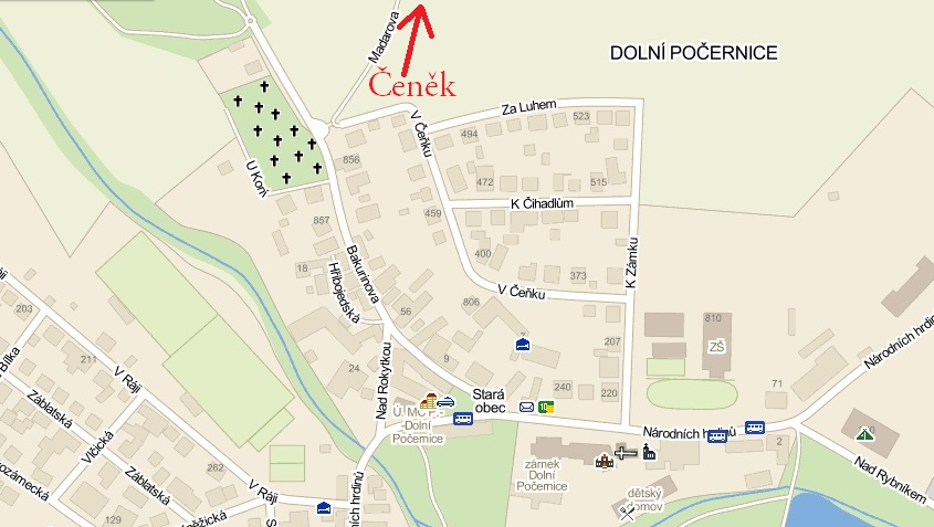 Z Dolní Počernice se jeví jako vhodná zastávka Stará obec, kde staví autobus č. 163. Je to asi o 900 metrů od Čeňka.