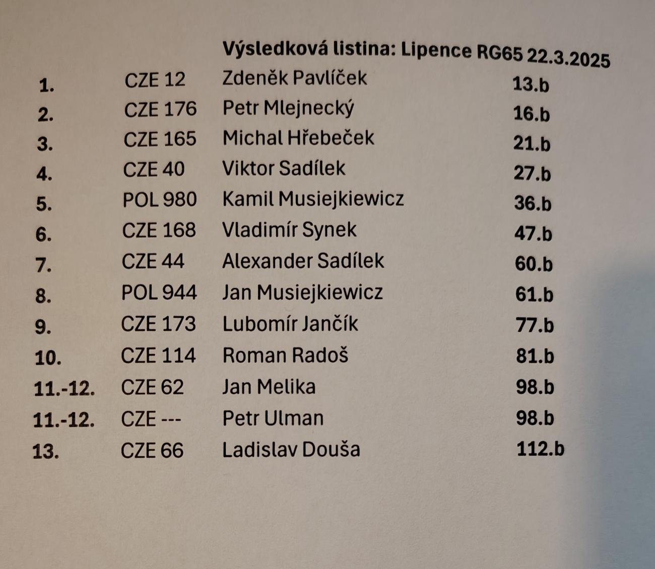V případě plachetnic RG-65 nemohu nasazené plachetnice popisovat vůbec, jelikož jsem většinu z nich viděl poprvé. Zvítězil Zdeněk Pavlíček (CZE 12), druhý byl Petr Mlejnecký (CZE 176) a třetí místo obsadil hlavní pořadatel Michal Hřebeček (CZE 165). Tomu náleží poděkování za uspořádání akce.
