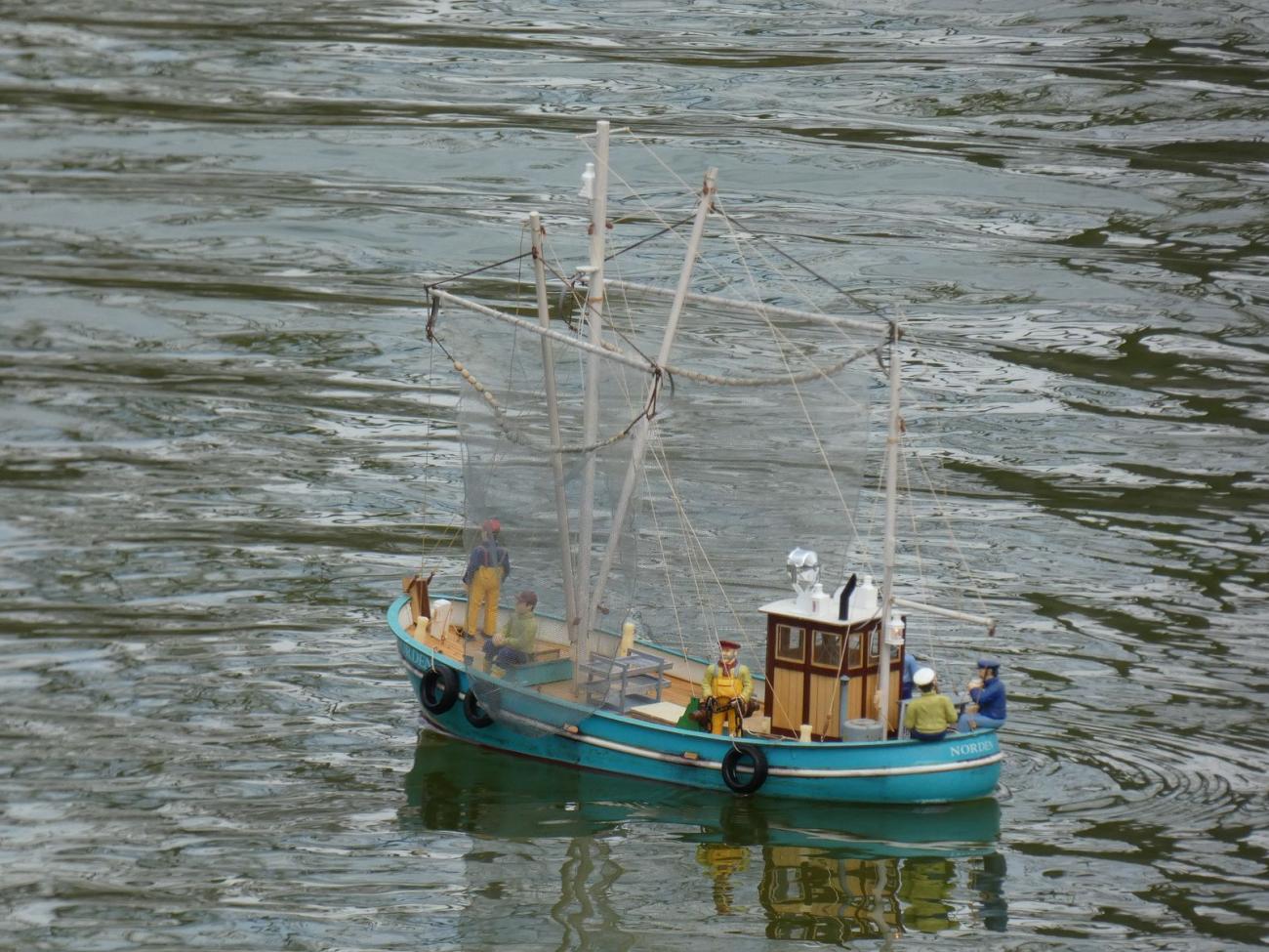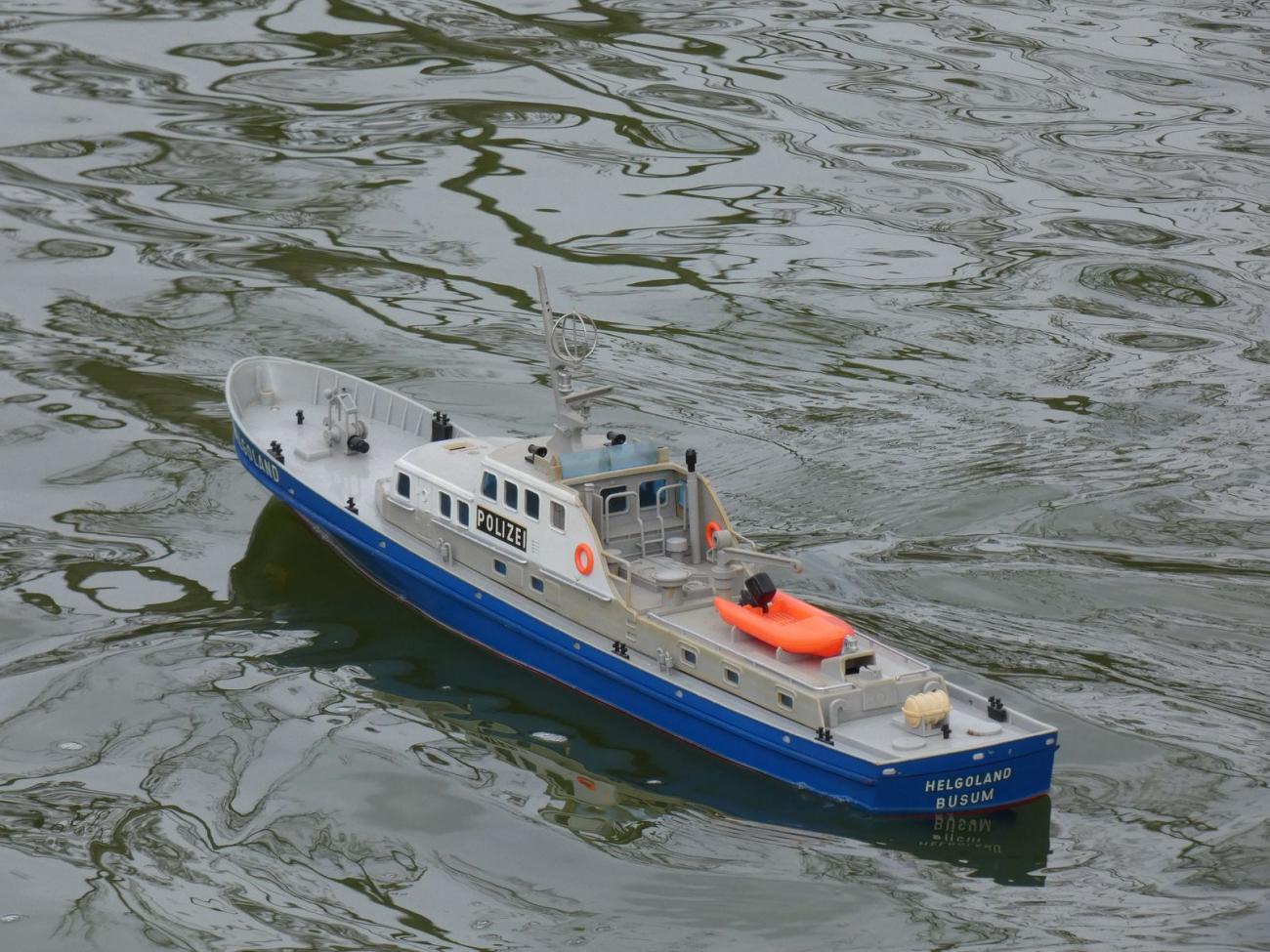 Sám jsem dorazil s německou policejní lodí Helgoland z dnes již historické hračky, kterou vyráběla Carrera v 70. letech. Jelikož se mi nepodařilo zprovoznit původní RC soupravu, putovala do trupu elektronika 21. století. Jen původní elektromotor i s převodovkou a lodními šrouby jsem s radostí využil.