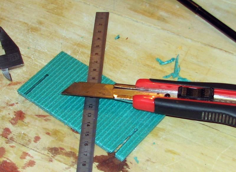 2) Nejlépe z plastové destičky (jinak postačí třeba "tácpron") vyřízneme obdélník, který bude cca o 40mm delší než je rozteč hřídelí kormidel a zhruba o 20mm širší, než je max. šířka kormidla. Na destičku si nakreslíme profily kormidel tak, aby byly rovnoběžné a vzdálenost os profilů byla rovna vzdálenosti středů os hřídelí kormidel.