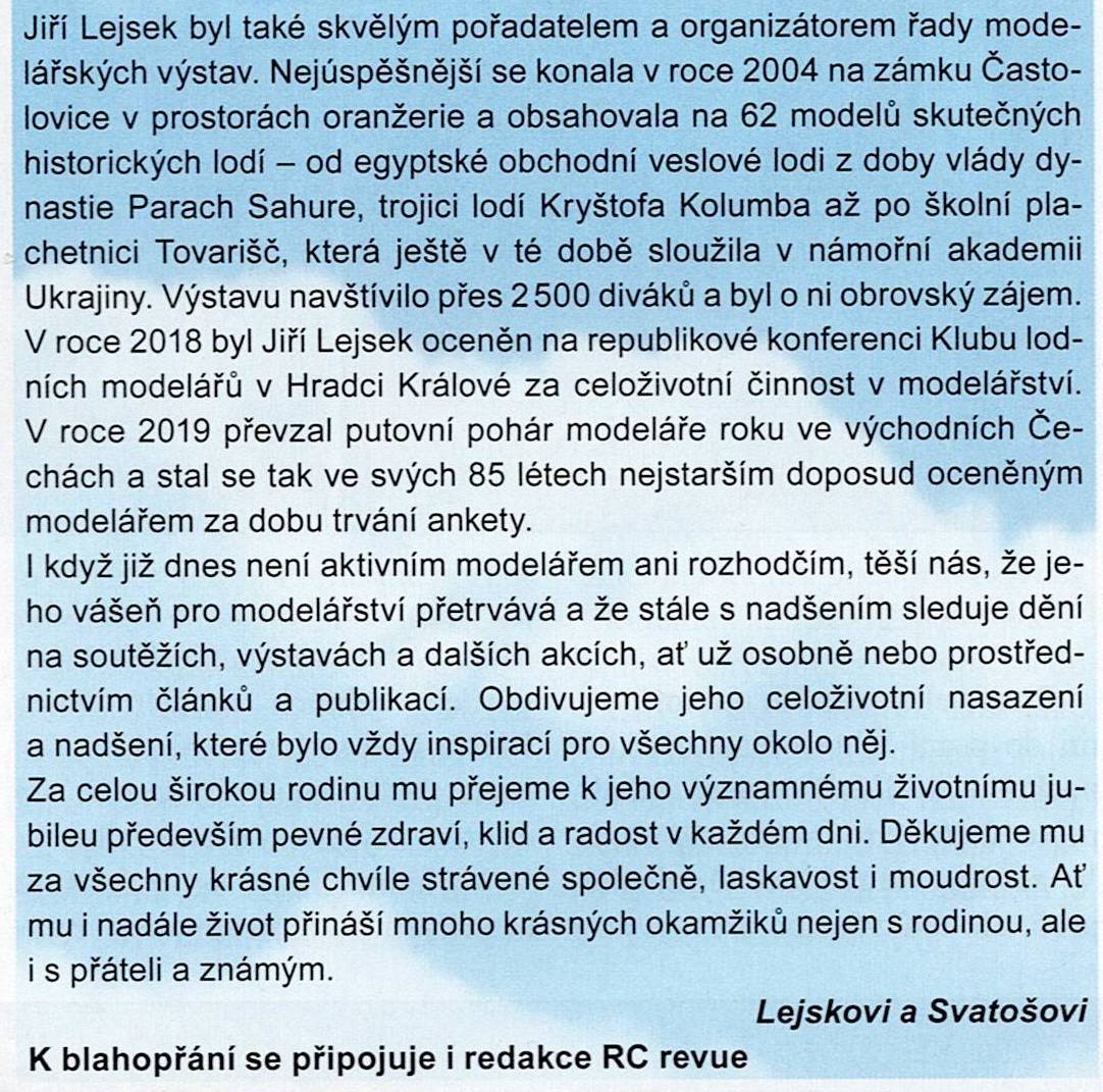 Z rozsáhlé publikační činnosti oslavence můžeme zmínit 100 čísel Zpravodaje KLoM ČR, přičemž většinu čísel si můžete stále přečíst na webu. V modelářských časopisech dřívějšího data vydání najdete také spoustu reportáží, ponejvíce ze soutěží FSR, kterým se věnují i potomci Jiřího Lejska, jejichž text z aktuálního čísla RC revue najdete níže.