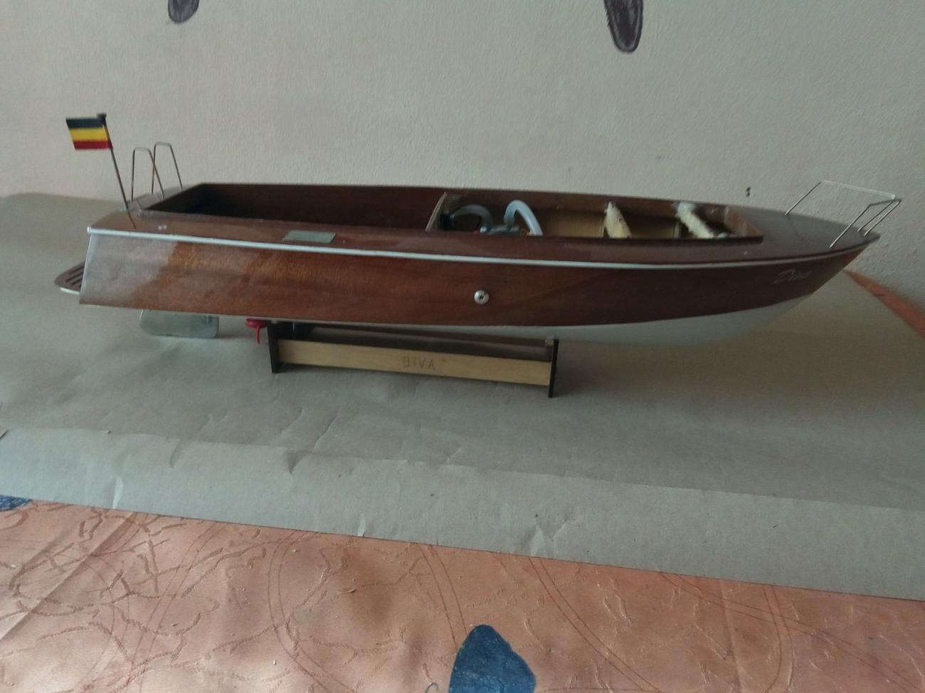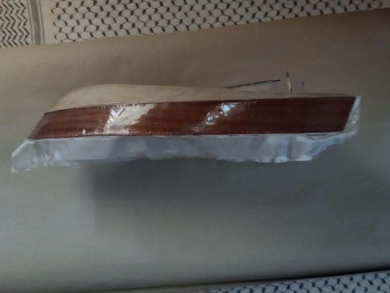 Motor stejnosměrný MIG 480 Li s chladící spirálou, regulátor stejnosměrný oboustranný New Rain 60 A, kormidelní digitální microservo Corona DS 939 MG (2,5 kg tah, kovové převody)a lodní šroub Graupner 3-list průměru 26 mm. Po rychlé hrubé stavbě následovala pro mě nejhorší etapa – laminování s tkaninou, vytření překližkového vnitřku trupu i kabiny epoxidem. A pak pořád dokola – trocha tmelení, moře broušení, barvení, lakování… Nakonec uplynul téměř celý rok, než jsem dílo dokončil. Skoro jako pověstné – do roka a do dne, hyn sa hukáže…