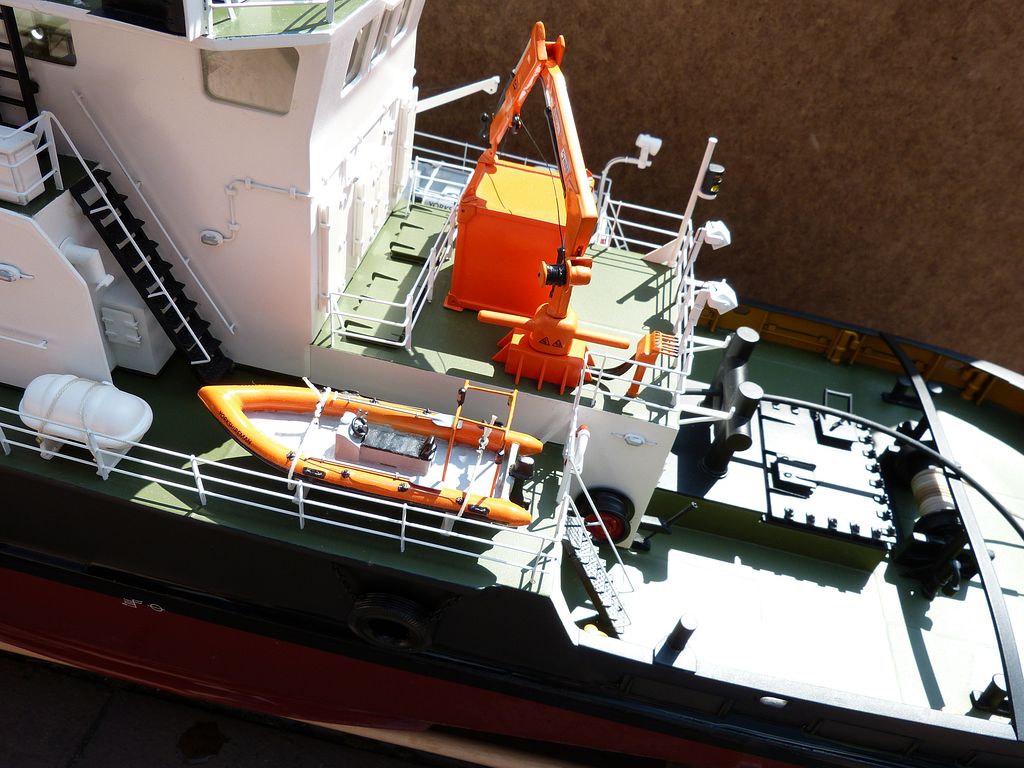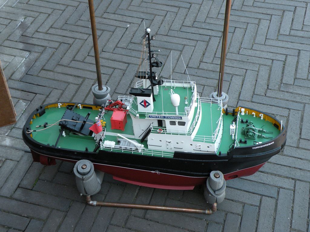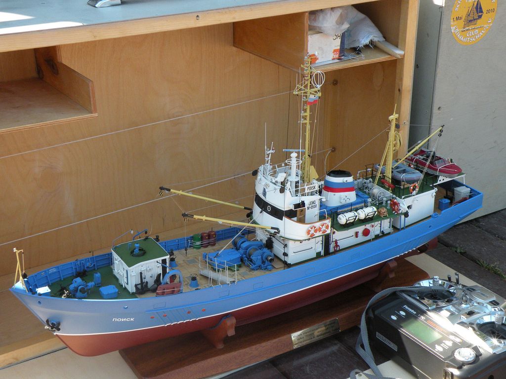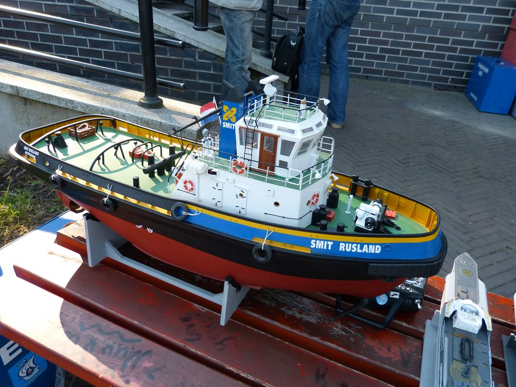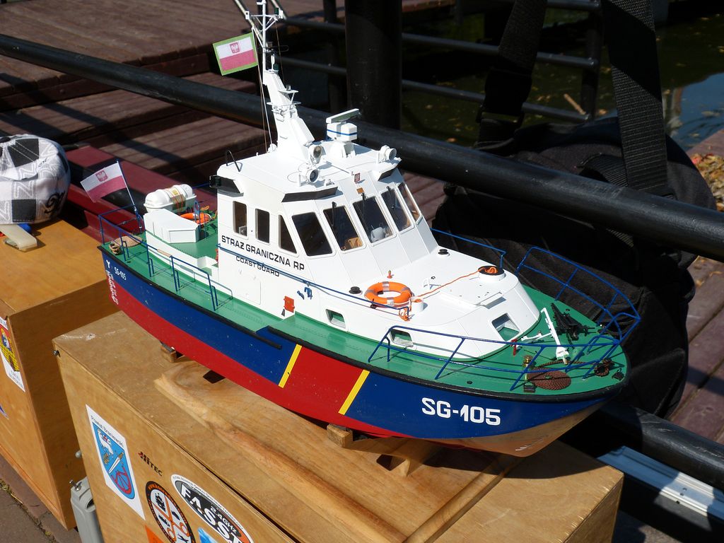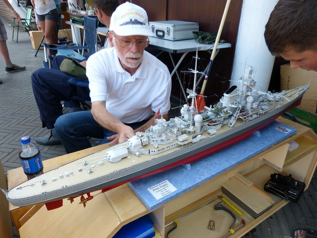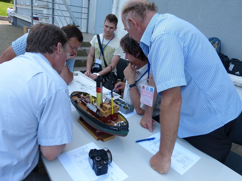 Start F4A proběhl dopoledne ještě před zahájením, junioři Tomáš 98 – dotek skluzem zadní bójky, Ondra 95 – nevýrazné zastavení v doku – pohyb lodě. Já v seniorech 92 – první dlouhá, druhá dotek zadní bójky. Takže ještě není ani zahájeno a my jsme někde na chvostu, jedině 98 Tomáše díky slabým výsledkům i ostatních zatím stačí na 2. až 6. místo. Po dojetí F4A začínáme shánět, kde bude bodování F4B, zatím nikde žádné informace nevisí, loňské místo je zcela prázdné. Jediné, co nás trochu uklidňuje, je, že zatím máme na kontrolou rozhodčí, ale ani ti nic neví, jen nás odkazují na velkou zděnou budovu v parku, tam v suterénu nacházíme pracoviště s počítačem – prázdné a místnost pro uskladnění lodí. Už je čtvrt hodiny po plánovaném začátku bodování F4B junior a stále nejsme na správném místě, pak nám někdo řekl, že to bude asi venku na druhé straně budovy. Za budovou je opravdu několik stolků a modelů. Chvíli po nás na toto místo docházejí i naši rozhodčí, stoly ještě blokují s F2A, takže ještě chvíli čekáme. Z juniorů jde první Tomáš, u Falkeho nacházejí jedny otočené dveře, chvíli je diskuze o poloze kotvy, bohužel z našeho mistrovství nemá zažitou diskuzi s rozhodčími, takže nedokáže prodat, co je na lodi jiného než díl ze stavebnice. Nakonec dostává 85,33 bodů. Po něm jdou na řadu tři Rusové s letitým Smit Russland (překreslený Smit Roterdamm) 87 b, policejní hlídkový člun Bremen a nakonec taky letitý se zvlněnou palubou Canute 91 b. Po juniorech je na řadě F4B senior, první je polský Yorkshireman, také už minimálně osmiletý, oproti dokumentaci ze stavebnice má dost detailů vlastních, ale některé vypadají hůře jak ze stavebnice. Oproti mně má v dokumentaci přiloženo asi 15 fotografií Yorkshiremana a pár sesterského Irishmana, který má jiné zbarvení, takže tyto rozdíly musí vysvětlovat. Také na jiných fotkách rozhodčí nacházejí drobné rozdíly – výška světlometů, poloha záchranných kruhů... Rozhodčí se trochu diví, že si bodování prohlížím dost z blízka, dojde jim to, když se podívají na následující loď ve startovní listině. Když nacházejí opět Yorkshiremana, požádají Poláka, aby loď nechal u nich na stole a já stavím okolo svou. Opět se vracejí k některým vytýkaným rozdílům a porovnávají je s mým provedením, u některých rozdílů argumentuji mými výkresy, kde požadované detaily nejsou. Při samostatném hodnocení podle mých výkresů mi nakonec nic nevytýkají, na vedoucího rozhodčích – Maďara – dostávám pochvalu za vyznačení svarů na palubě a jednolitý lesk (mat) na trupu (Polákovi vyčítali lesklé ponorové znaky). Nakonec Yorshiremany ohodnotili – polský 85,67, můj 90 b. Po mně jde na řadu Němec s remorkérem Resolve – 95 b, Maďar s moderním křižníkem z čínské stavebnice Kalinin – 96 b, pak už jen Rusové: rybářský kutr od Graupnera Elke 95,33 b (na MS 2013 87,3 b) a Bismarck 97,67 b.