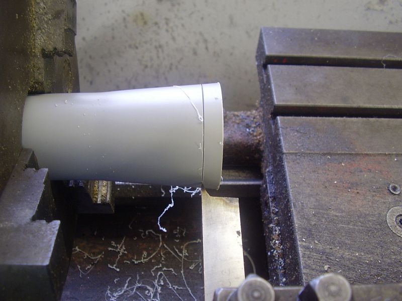2. Prvý vytvorený a vychladnutý kónus som premeral a jeho čelo som na sústruhu upichol v mieste, kde sa jeho vnútorný priemer rovnal priemeru lodnej skrutky plus 5mm, aby pri zložení celého kompletu vznikla medzi telom dýzy a listom lodnej skrutky dilatácia 2,5 mm. Nakoľko nie som odborník, hĺbku tela dýzy som zvolil iba od oka a telo som upichol s dĺžkou 45 mm.