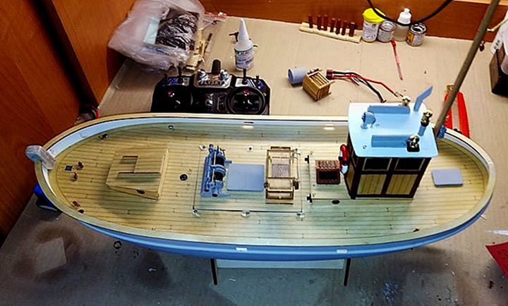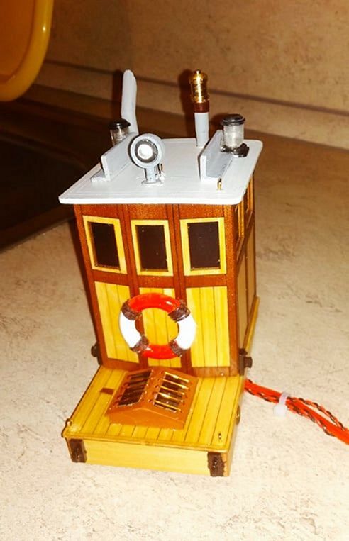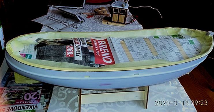 Jednotlivé nástavby (přední světlík, kajuta, naviják, síto) jsou slepeny dle obrázků. Kajuta je osvětlená LED diodami (poziční světla červená a zelená, přední reflektor).