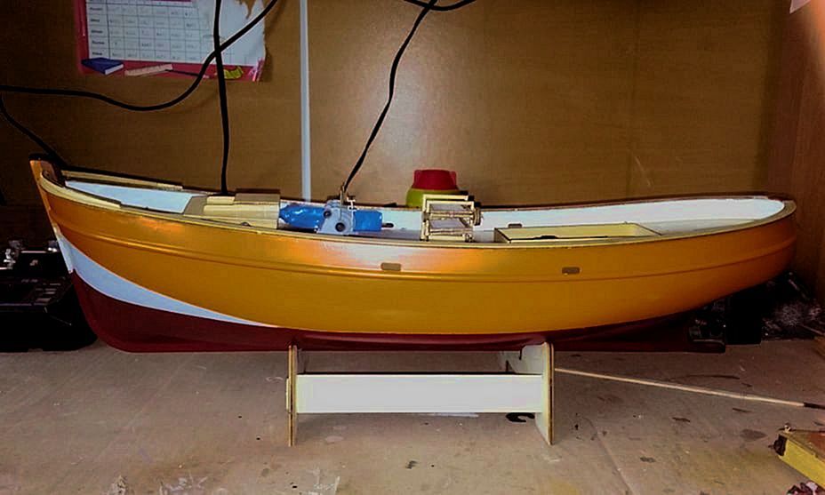 Stavbu jsem začal sestavením stojánku a motorového lože. Všechny díly do sebe perfektně zapadají, stačí pouze přebrousit jemným smirkovým plátnem (použil jsem plátno 400). Po slepení jsem polotovar nalakoval 2x acetonovým lakem. Motorové lože je osazeno motorem (SPEED 400) a servem – jako celek vlepeno do trupu lodi. Kormidlový komplet jsem rovněž vlepil do trupu.