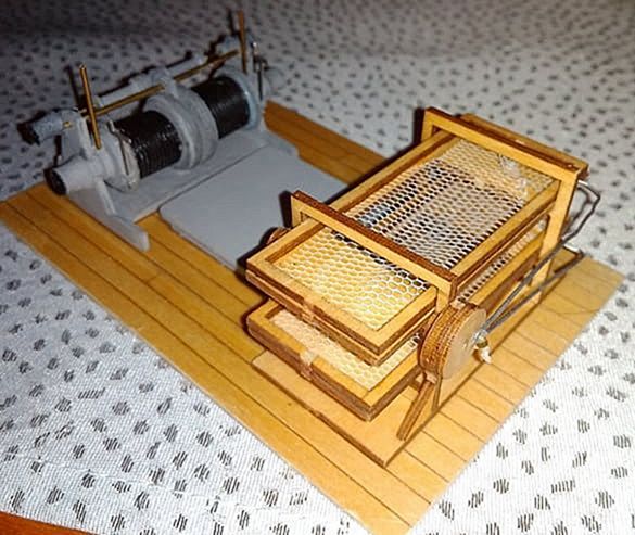 Po zaschnutí a vytvrdnutí barvy jsem palubu a trup spojil v jeden celek. Práce vyžaduje opatrnost a pečlivost, trup je v horní části měkký a paluba po nalakování trochu tvrdší. Při násilné manipulaci hrozí rozlomení paluby nebo prasknutí trupu. Postupoval jsem zpředu nasunutím výřezu a postupně jsem zasouval palubu do drážky v trupu. Pro správný tvar sítí jsem si před jejich vystřihnutím nakreslil papírovou šablonu. Ušité sítě jsem na několika místech zafixoval vteřinovým lepidlem. Nakonec jsem nalepil na zadní část paluby kamna, sušičku a kolem paluby 7 kusů úchytů. Stěžně a lana jsem dohotovil až na sestaveném modelu.