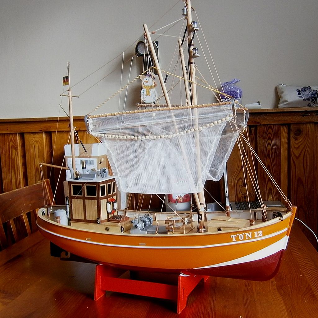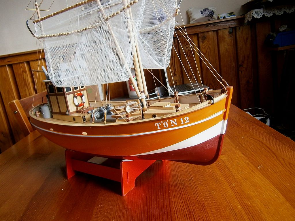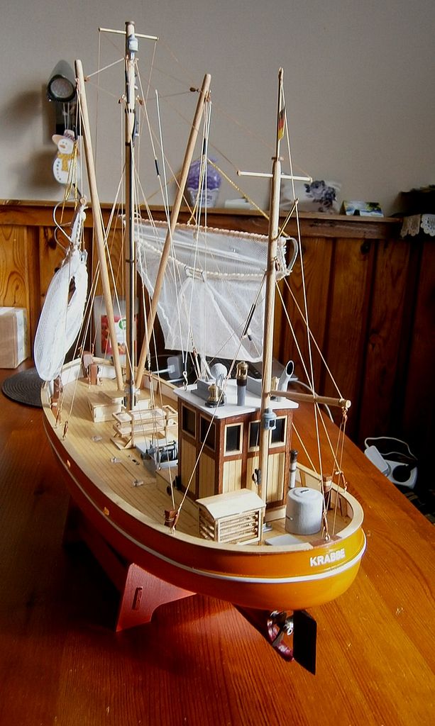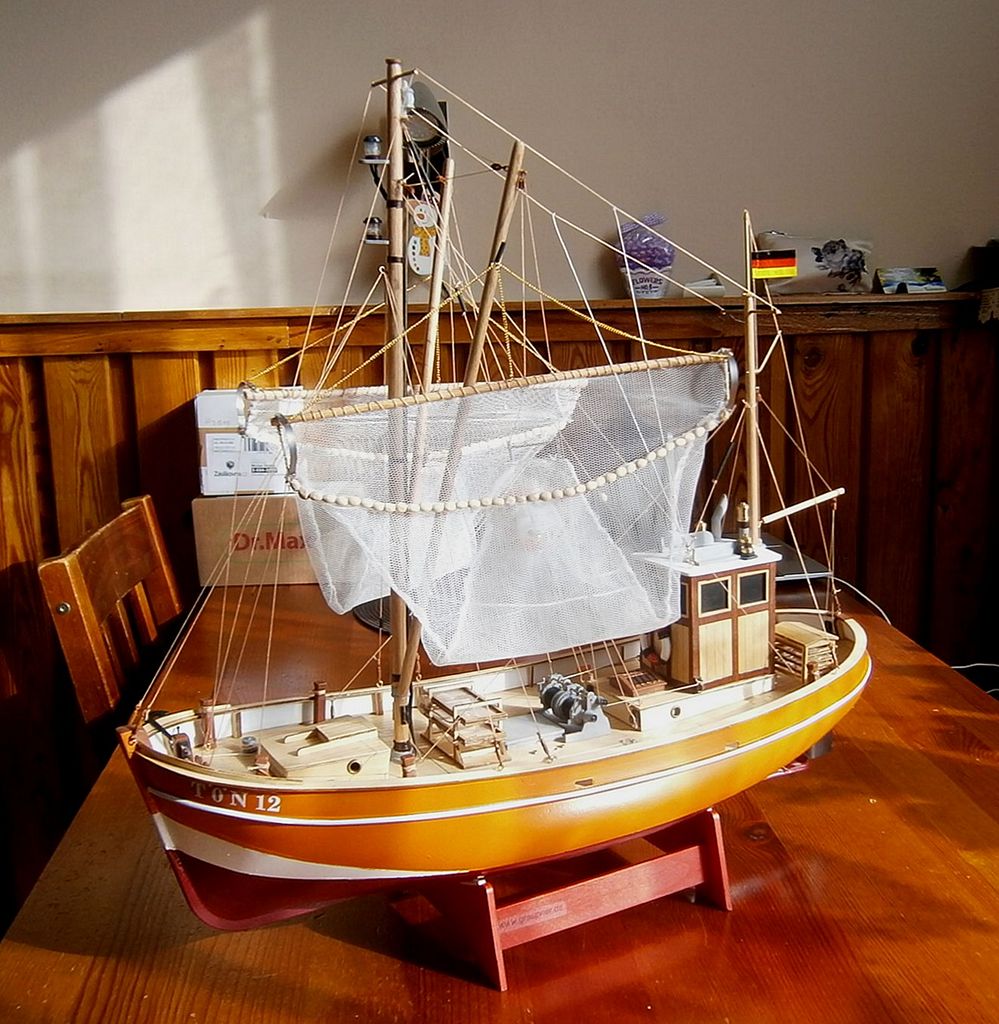 Stavebnice německé rybářské lodi v měřítku 1 : 25 je dodávána v krabicovém balení, obsahuje všechny potřebné díly z překližky (předřezané laserem), materiál na sítě (nutno nastřihat a ušít), trup z ABS plastu, servo, motor SPEED 400, včetně kormidlové sestavy, lodního šroubu a hřídele s uložením. K dispozici jsou velké plány A1 (2 ks), na kterých je loď zobrazena v původním měřítku. Při výrobě stěžňů a jejich kompletaci jsem využil přiložené nákresy v měřítku 1 : 1. Odměření lze provést přímo.