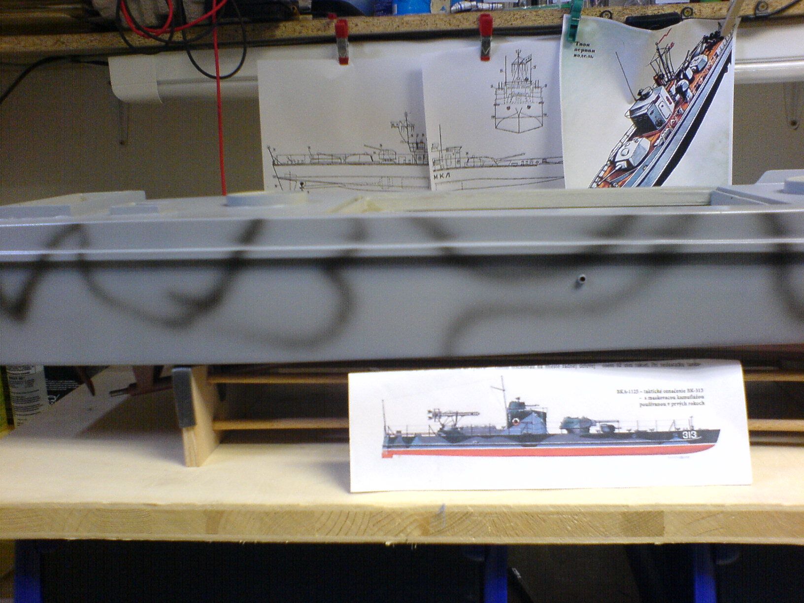 Rozhodl jsem se pro klasiku, jak je popsána v návodu. Žebra okopírována na papír a nalepena na překližku 4mm.(foto 1). Stavba provedena na desce dnem vzhůru. Lišty použity 5x5mm. Potah udělán z voduvzdorné překližky 1mm(foto3). Příď po druhé žebro je uděláno vodotěsné a „vycpáno pěnou“ snad to pomůže, pokud se snad……… No a nyní nastalo dilema, jak na palubu dvě dělové věže? Nebo kaťuše? Samozřejmě po poradě se synkem je jasno! Rakety! (ještě že je na koho to svést) Tak je rozhodnuto, to jsem ještě netušil, co mě čeká. Paluba z překližky 1,5mm vyvrtána, vyřezána a olemována. (foto 4)Pohon byl po probrání na chatu MoNaKa jasný 2x 600.(foto5)