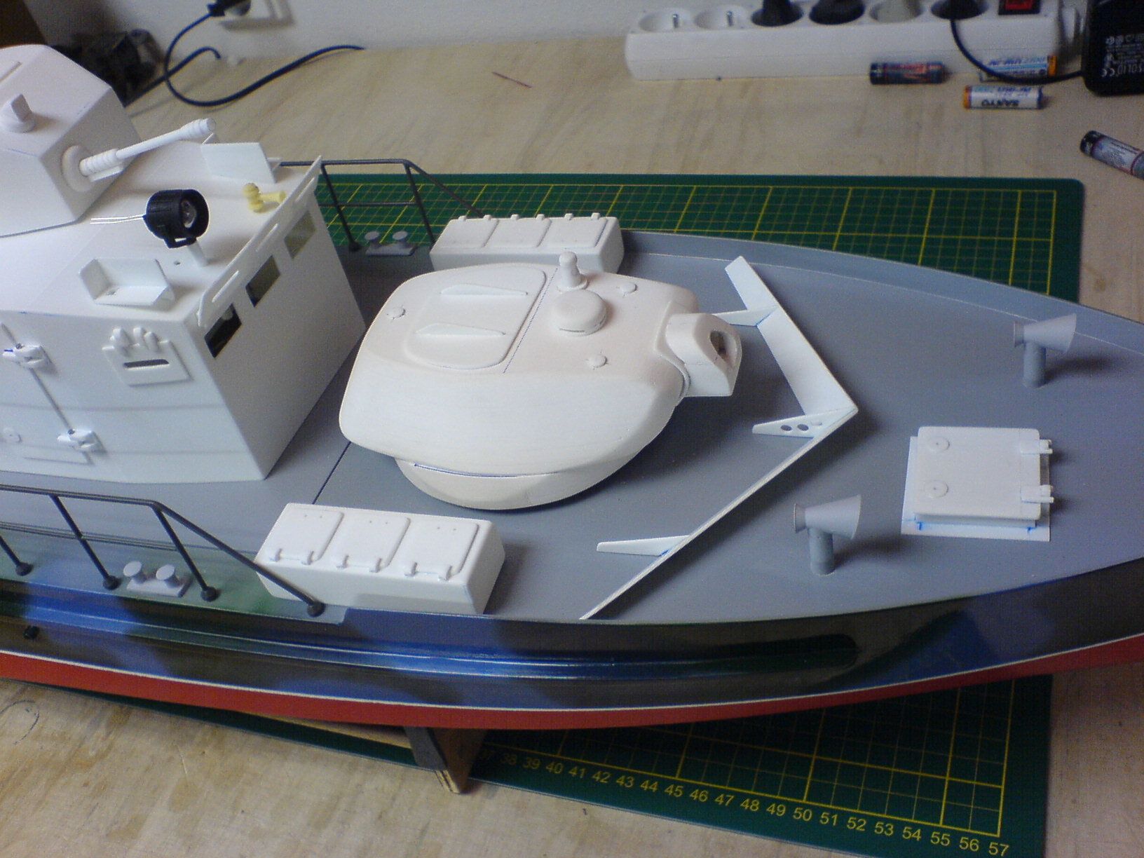 Na nástavby jsem použil materiál PSH síla 1.3mm. Krásně se řeže lámacím nožem a při zabrušování nevzniká prach. Lepení je provedeno vteřinovým lepidlem a Toluenem. Nezapomenout větrat, jinak je to horší než pár piv!! (foto16) Dělová věž slepena z PSH 5mm a pilníkem opracována do tvaru. Doplňky ze slabšího materiálu.(foto 17) Po zabroušení a vykytování (Miliput tmel) a stříknutí všech vrstev to vypadá následovně.(obr 18) Stále ale nejsou hotové kaťuše. Kde koupit profil I ? Jasně firma Litomyský má výběr snad všeho co se dá. Po pár dnech jsou doma. Začalo řezání a vrtání.(foto22) Rakety jsou udělány dřevěné kulatiny o průměru 8mm. Soustruženy ve vrtačce, stabilizátory z PSH vlepeny vteřináčem.(foto26) Elekro vybavení se sládá ze dvou Dsysu 30A, mixu, výkonového spínače to z důvodu že vypínač je umístěn v nástavbě za zadními dveřmi a je pouze 1Ampérový.(foto28) Spojení z nástavby je provedeno 7mi kolíkem. No, a protože zůstali dvě Kaťuše a je škoda je nechat ležet vznikla tato bedna.(foto 29). První plavba proběhla na Splaviskách a celkem úspěšně alespoň podle kapitána.(foto 31) Pokud začínáte stavět lodičky tak tento model je velmi vhodný pro začátek. Tak a nyní hurá na Přeříze.