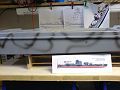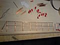 Vodní chlazení je samozřejmé, vytékající voda je efektní. Uvnitř trupu je uděláno místo pro Pb aku na dvou místech. Mám rád dlouhou jízdu bez nabíjení. V návodu jsou dvě možnosti provedení paluby. Rozhodl jsem se pro kompromis. Udělal jsem výřez větší než nástavba a osazení drážkou ze silikonové hadičky.(foto 7) Trup je laminován dvakrát stodvacítkou tkaninou. Nasávání jsem udělal tak, aby navazovala na kormidla.(foto8) Konečně nastal ten okamžik a po základovce se začalo uvažovat o povrchové úpravě. Jednobarevná úprava byla zavrhnuta. Hodně barev! Takto to začalo, čmáráním airbraschovou pistolkou!(foto9) Barvy jsou použity dvousložkové odstíny podle RAL. Je to moje první použití této technologie. Komresor Calex lednička. No a toto je výsledek.(foto11) Tak a nyní udělat pár detailů. Začal jsem člunem a výfuky. Člun je vybroušen z balzy, dno překližka. Rohož je udělána z lišt 2x5mm. Výfuky musí být samozřejmě dva. Mosaz a měď, celé pájeno.(foto13) V návodu není žádné zábradlí ale, když už jsem v tom pájení…. Materiál Cu 1,5mm a 2.5mm.(foto14)