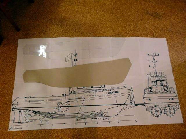 Po niekoľkých selekciách sme vytypovali tento remorkér. Po zväčšení plánu na kopírke do požadovanej veľkosti a jeho pozlepovaní z listov A3 sa mohlo začať.