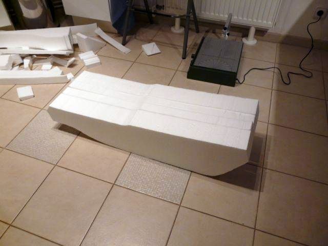 Na záver to chcelo trochu fantázie, sochárčiny a šmirgel nalepený na drevenom hranole. Dôležité je pritom udržať plynulosť línii a súmernosť trupu. Na snímkach je prakticky hotové polystyrénové kopyto vedľa môjho rozostavaného Smit Denemarken (1/33, cca 80 cm).