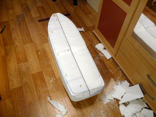 Podľa plánu som vyrobil z transparentnej fólie ešte šablónu pôdorysu lode ( polovicu trupu) . Na fóliu som si nakreslil priebeh všetkých dôležitých línii trupu ( najväčšia šírka, línie bortov, línie dna). Podľa šablóny som na polystyrénový blok nakreslil pôdorys, nahrubo orezal nožom a obrúsil do pôdorysného tvaru.