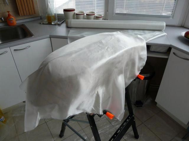 Ďalší postup je viac-menej štandardný a bol viac krát popísaný. Použité boli tri vrstvy keprovej tkaniny 120g/m2. Všetky vrstvy boli kladené "za čerstva", tzn. bez vytvrdnutia predchádzajúcej vrstvy. Tkanina bola položená diagonálne na os trupu, aby sa ľahšie ohýbala cez hrany. Nastrihávanie tkaniny bolo nutné na špici a na zrkadle lode.