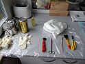 Nachystal som si pomôcky na laminovanie. Ako živicu som použil staré zásoby epoxidovej CHS1500, čo je laminovacia živica. Epoxid 1200 je veľmi hustý a predovšetkým to je lepidlo a nie je určený na laminovanie a preto ho vrelo neodporúčam. V súčasnosti sú dostupné moderné laminovacie živice napr. Letoxit a podobne, ktoré sú ešte podstatne lepšie, ako CHS 1500, najmä preto že sú ešte redšie, čo je výhoda pri spracovaní a výsledný laminát je ešte kvalitnejší a tvrdší. Gumové rukavice tiež odporúčam použiť. Alergická reakcia nie je až taká sranda.