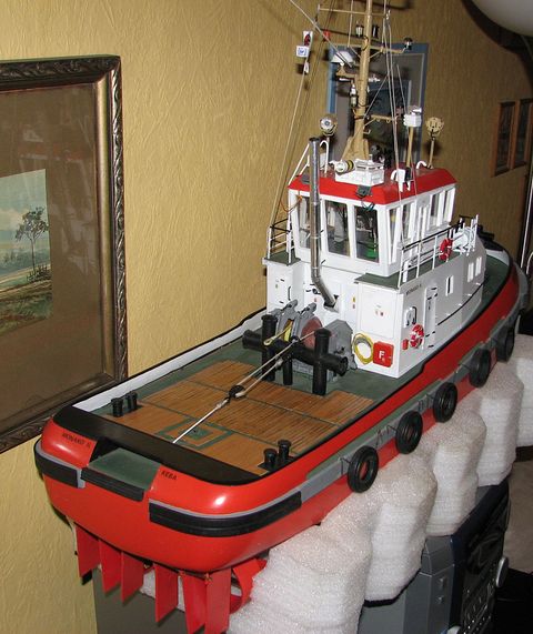 Postupně bylo doděláno několik detailů na střeše remorkéru. Výborným materiálem je starý tiskařský plech. Musí se ohýbat velice opatrně, aby se nezlomil, ale „nerezové “ skříňky se z něj dají udělat velice snadno a rychle. Palubu remorkéru ozdobily doplňky od Jardy Jungmana. Záchranné kruhy jsou vyrobeny z depronu.