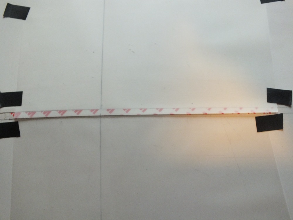 - Na vrch přilepím 3M pásku, ohnu zbytek mylaru, označím a oříznu na míru. Do ohybu dám 0,6mm uhlíkovou tyčku a zalepím (obr. 18 až 21).
