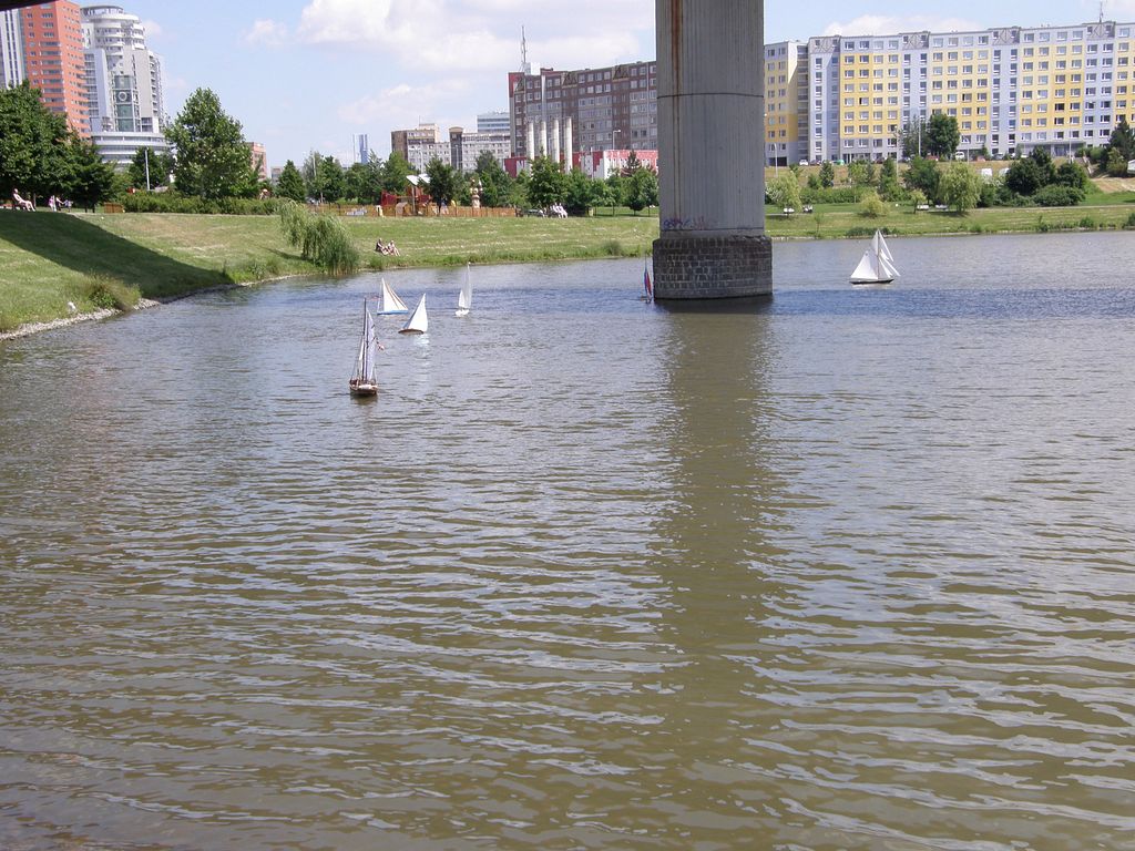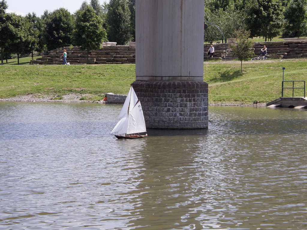 Celá regata probíhala za mírného vánku, který především kolem pilířů metra ukázal, jak je záludný. Na pilíř se tak během hodinového závodu přilepil nejeden model, ovšem vždy se to obešlo bez nutnosti nasazení záchranného plavidla. Největší náraz do pilíře pak zaznamenala moje KuM, když jsem se na poslední chvíli pokoušel uhnout těsně před ním - marně. Ohromná rána nevěstila nic dobrého, ale po ohledání modelu jsem žádné poškození neshledal.
