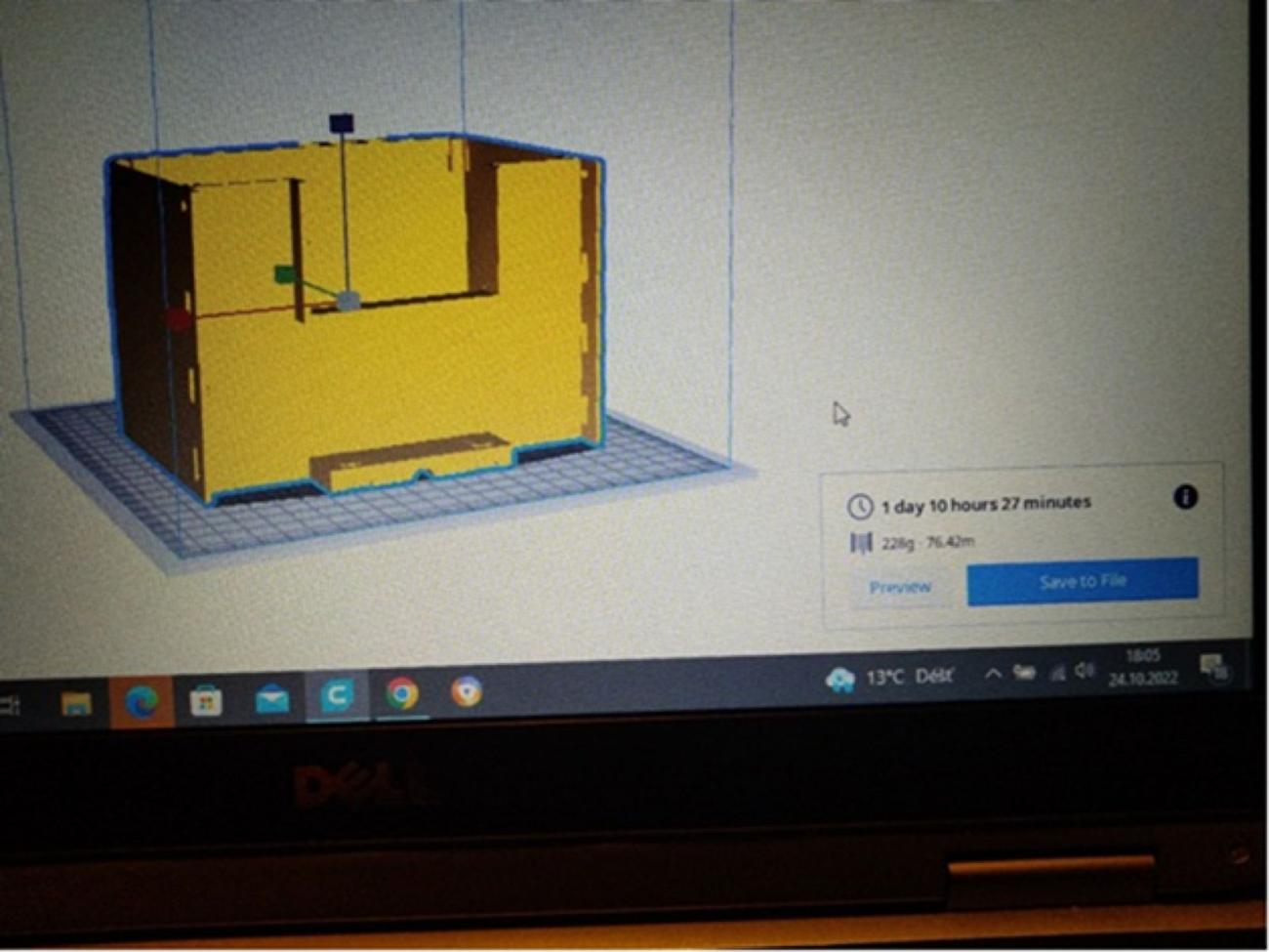 Po dvou týdnech různého zkoušení jak osově natočit do tiskárny zvětšené jednotlivé díly, jsem pustil první tisk. S dobou tisku jsem byl již při Slicování seznámen. Oproti tisku letadel od firmy Eclipson to bylo podstatně déle. Není se co divit. Modely letadel mají jen jednu stěnu a žádné nebo naprosto minimální výplně horní a dolní plochy. Já jsem nastavil horní a dolní plochy o síle jednoho milimetru, výplně na 10% a sílu stěny nechal, jak bylo v základních datech.