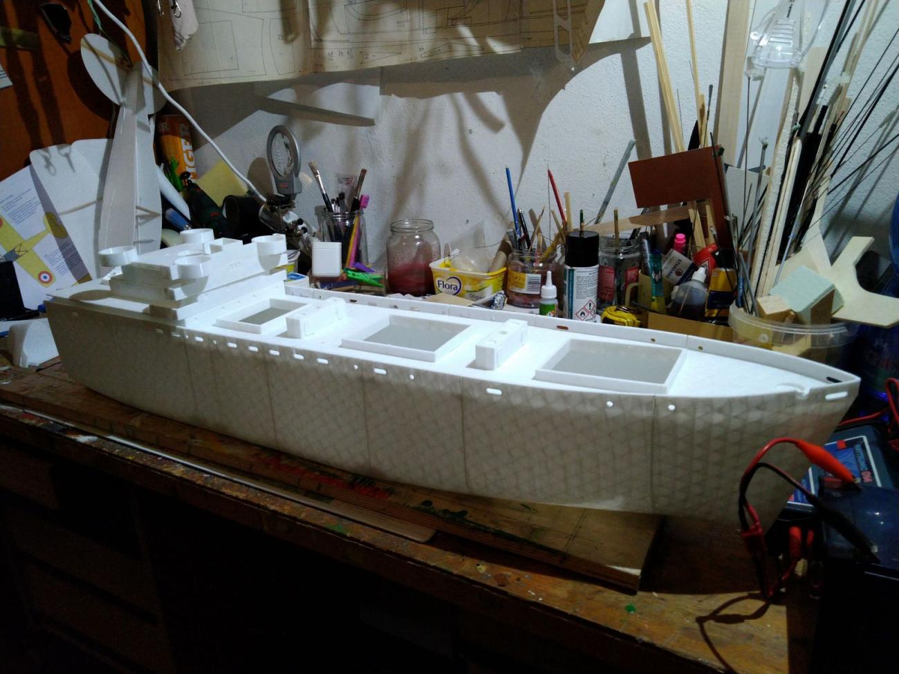 Při práci na trupu se v mezičase tiskly ostatní díly modelu, hlavní nástavba, kryty nákladových prostorů, palposty, komín, vzdušníky, palubní kanóny a záchranné prostředky.