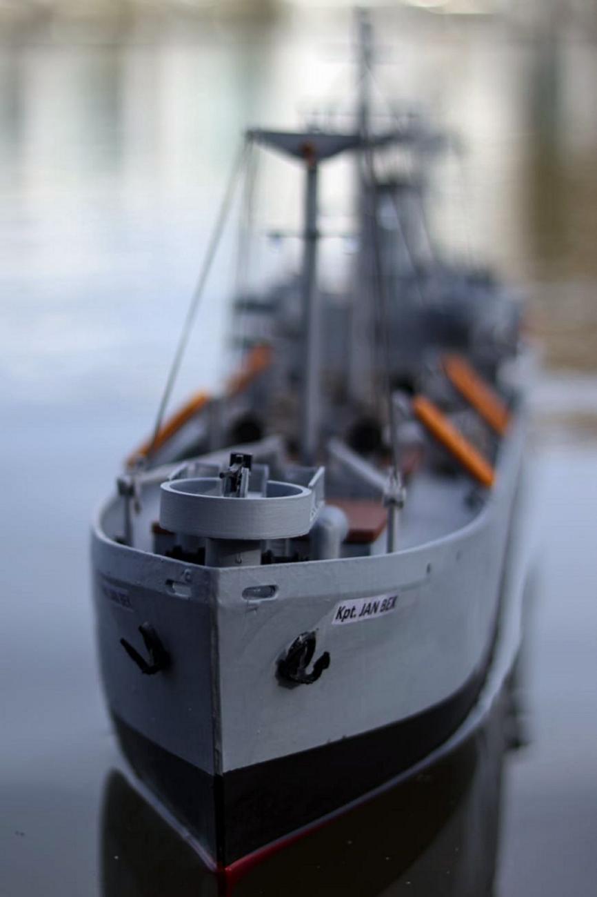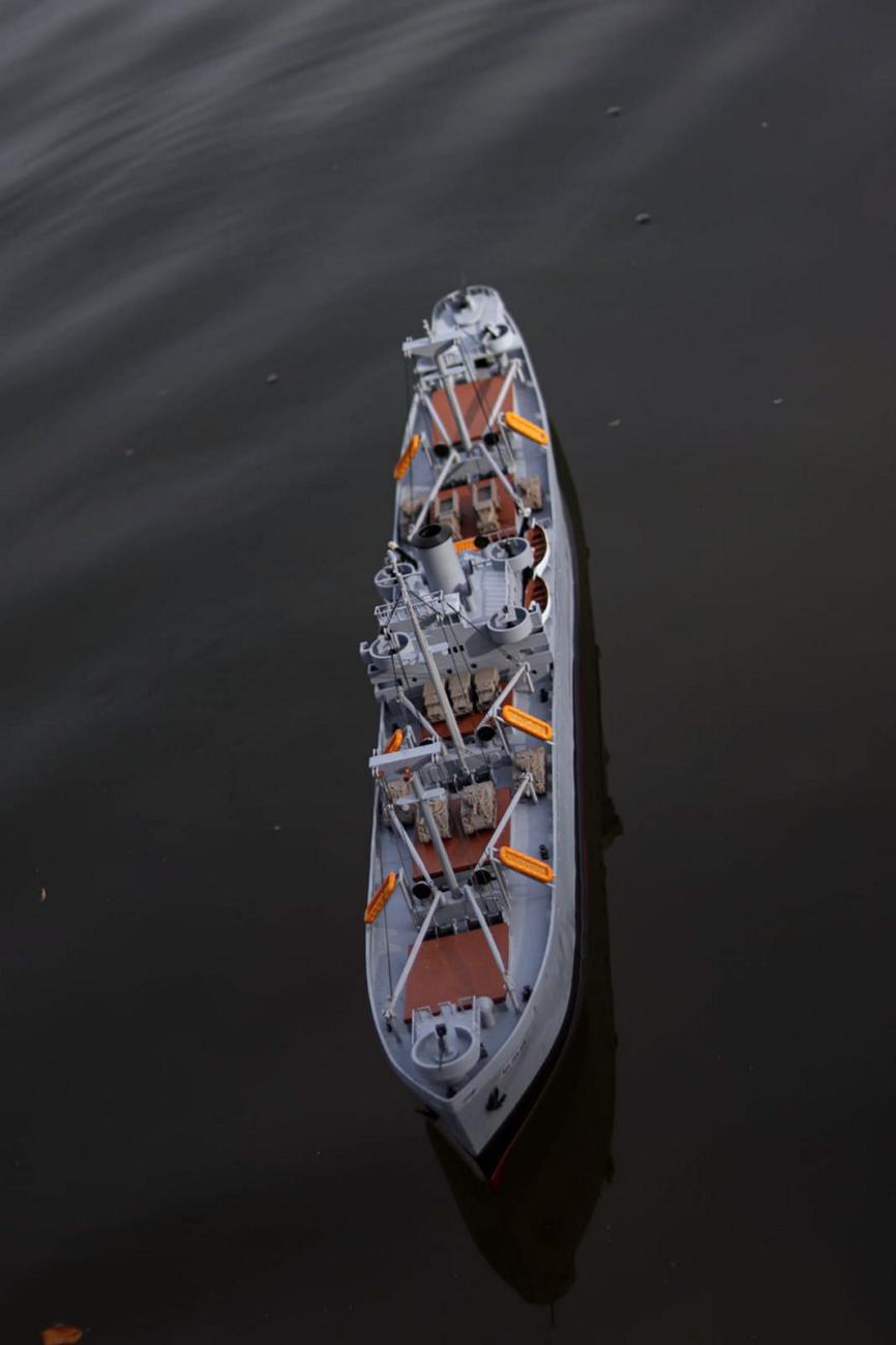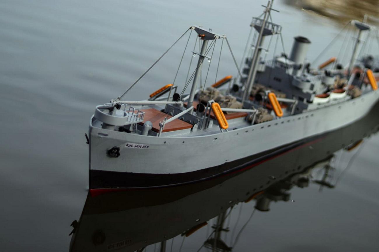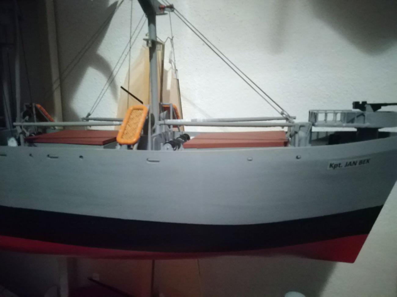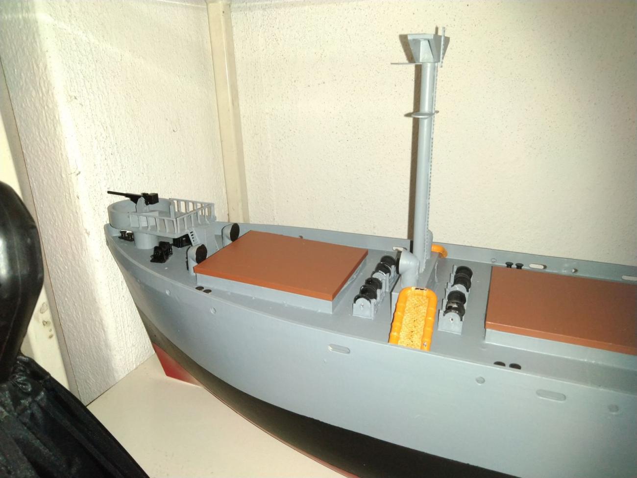 Po broušení, jsem zalepil hřídel s elektromotorem. Přívodní kabely jsem též naletoval předem. Díky připravenému původnímu loži motoru ač je po padesátiprocentním zvětšení, je instalace do osy snadná. Instalace kormidla je jako u jiných obdobných modelů. Osazený trup dostal jednu vrstvu nátěru matné šedé akrylátové barvy. Kormidlo je vytisknuté a je zalepené na ocelové kulatině o průměru 4 mm. Páku jsem měl od MPjet. Hřídel je navlečena do trupu, shora zajištěna pákou a zdola přilepenou patkou s otvorem pro hřídel ke kýlu.