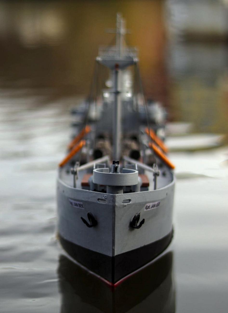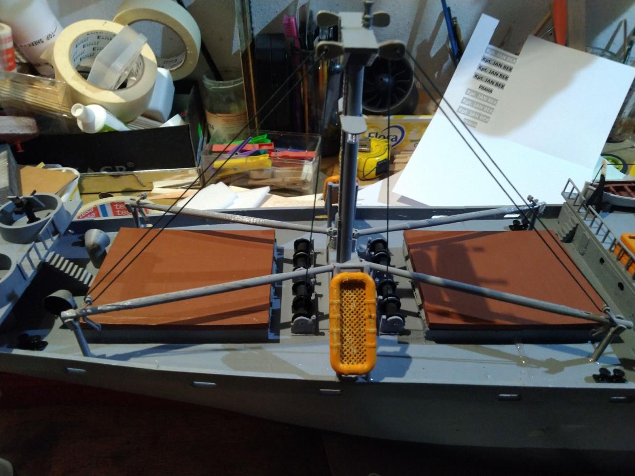 Na člunové palubě jsou čtyři záchranné čluny, po dvou na každé burtě. Moc se mi nelíbily. Něco hledání a použil jsem nalezená data pro model člunu z meziválečné osobní lodě. Myslím, že to vůbec nevadí. Čluny a záchranné ostrůvky se moc vzhledově neměnily. Tyto použité modely mají krásně vidět klinkrovou obšívku a lavice na sezení veslařů. Dále jsem vytiskl několik záchranných vorů a nastříkal je oranžovou barvou (měly by být šedé, ale takhle je na vodě vidět o něco lépe), a rozmístil je různě po modelu, kde si myslím, že by je tenkrát konstruktéři nebo posádka rozmístili. Tyto lodě měly stanoviště kormidelníka schované v horním patře nástavby, bylo nad ním na takzvaném pelingáči stanoviště hlídek a službu konajících námořníků a důstojníků. Toto stanoviště jsem opatřil lehkou stříškou. Následovalo osazení palubních kanonů.