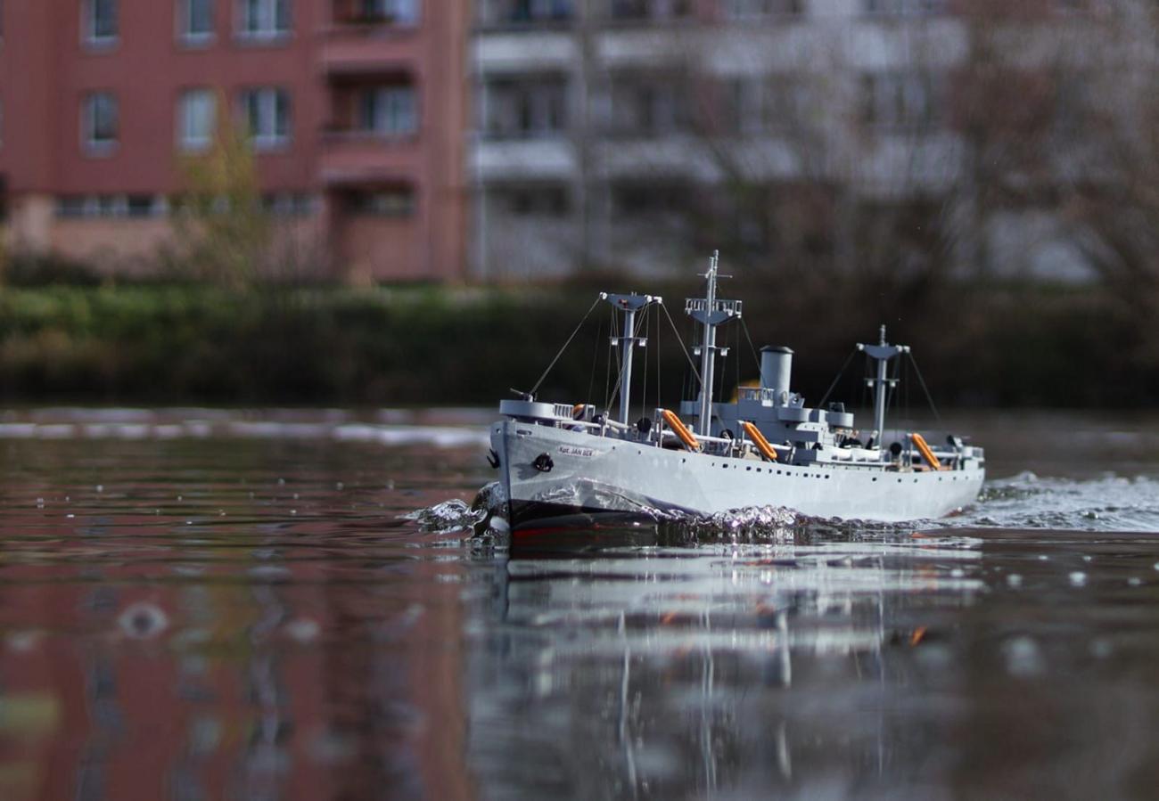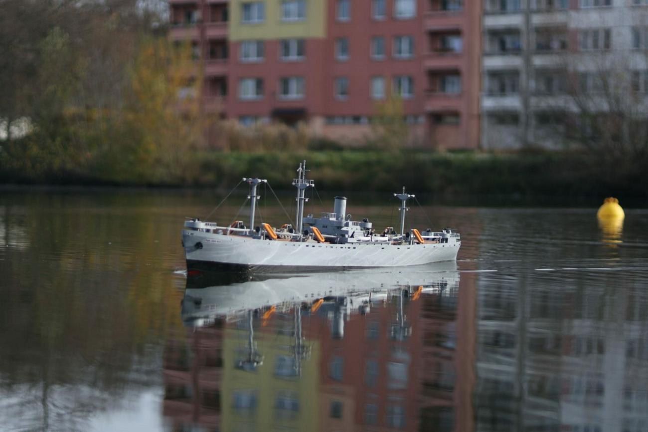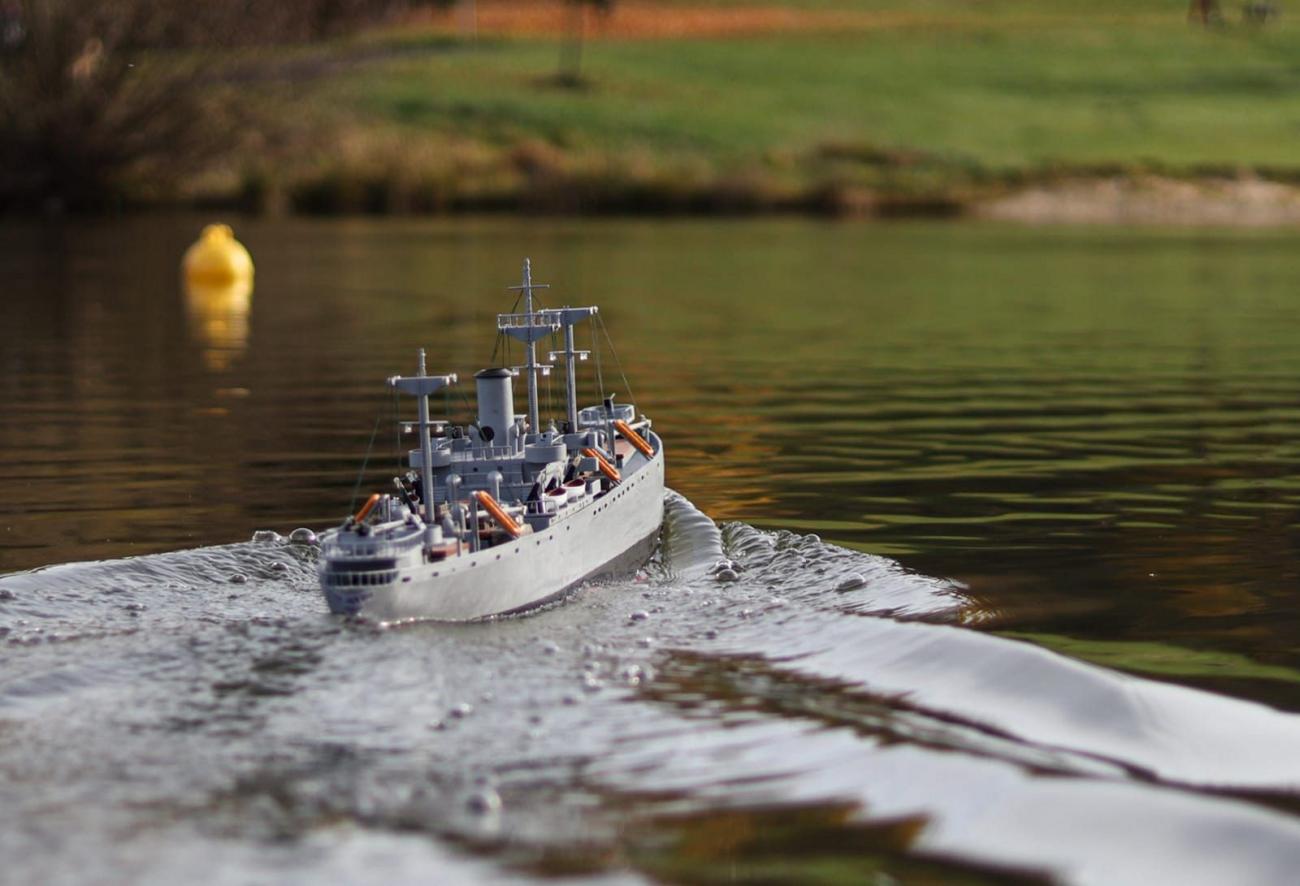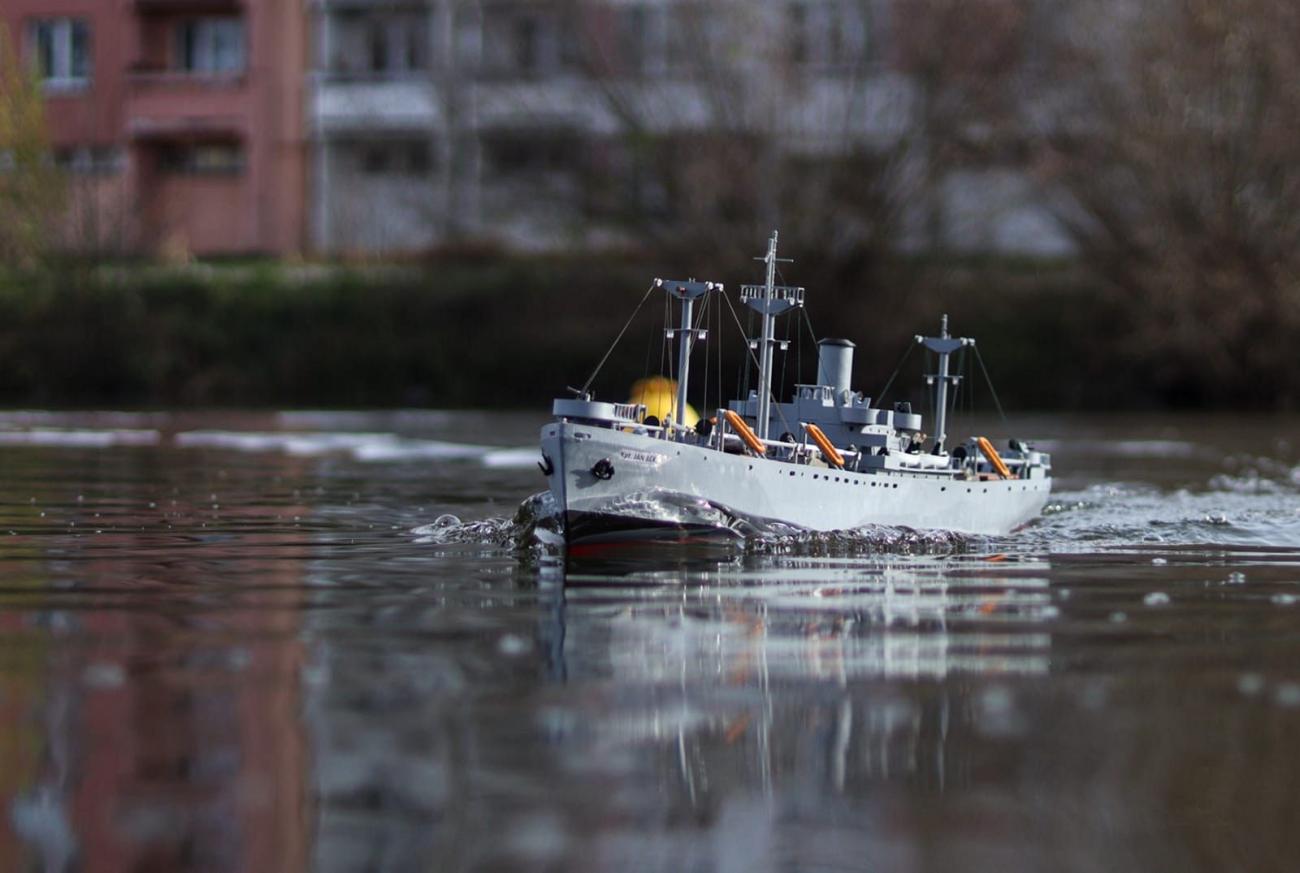 Po těchto stavebních krocích jsem musel loď vyzkoušet. První plavba proběhla na malém schovaném rybníčku u nás ve městě. K mojí škodě jsem tam byl sám. Fotit a kormidlovat mi dohromady moc nešlo. Při této zkoušce ještě byla osazena vrtule o průměru 40 mm od Graupnera. Elektromotor byl bez problému, stejně tak regulátor a zdroj, olověná gelovka 6 V/5 Ah. Plavba vpřed a obraty tak jak by mohl druhoválečný nákladní parník mít. Byl jsem nadšen, jako skutečná, jen při reverzu je graupnerka slabší. Momentálně má model tištěnou, čtyřlistou vrtuli. Couvání je sní o dost lepší.
