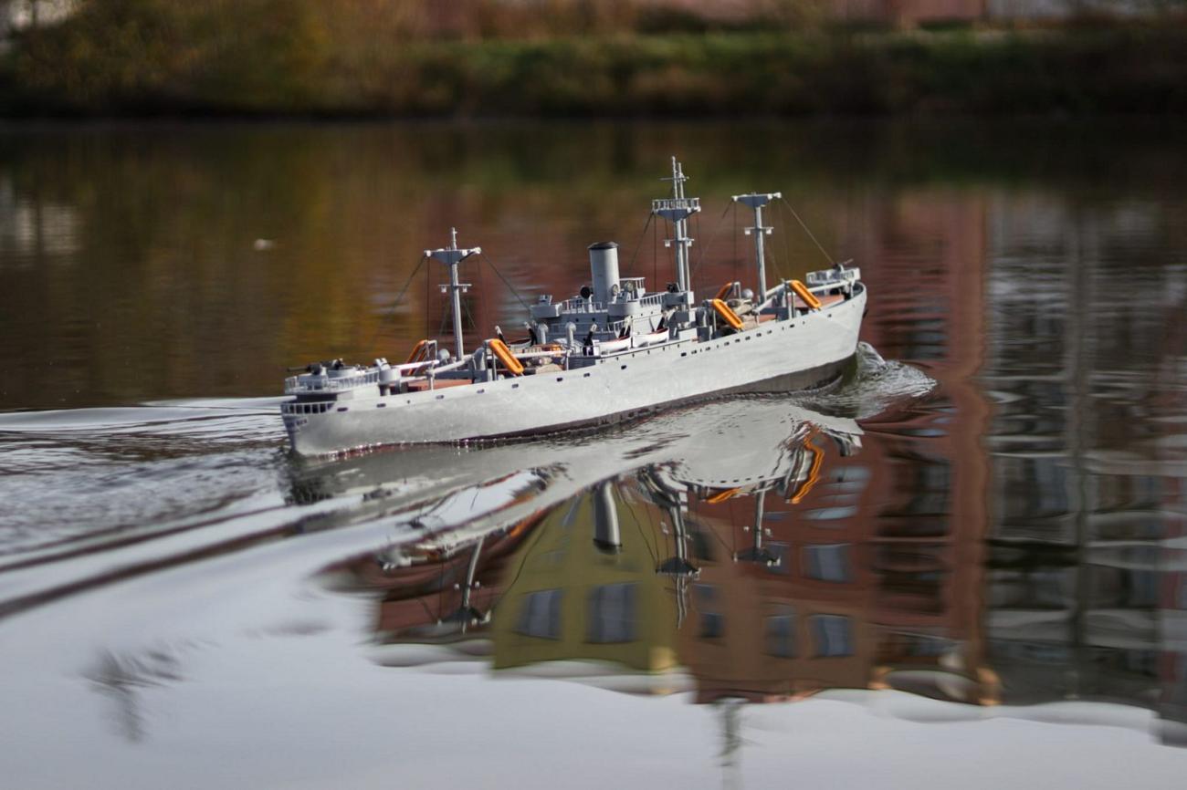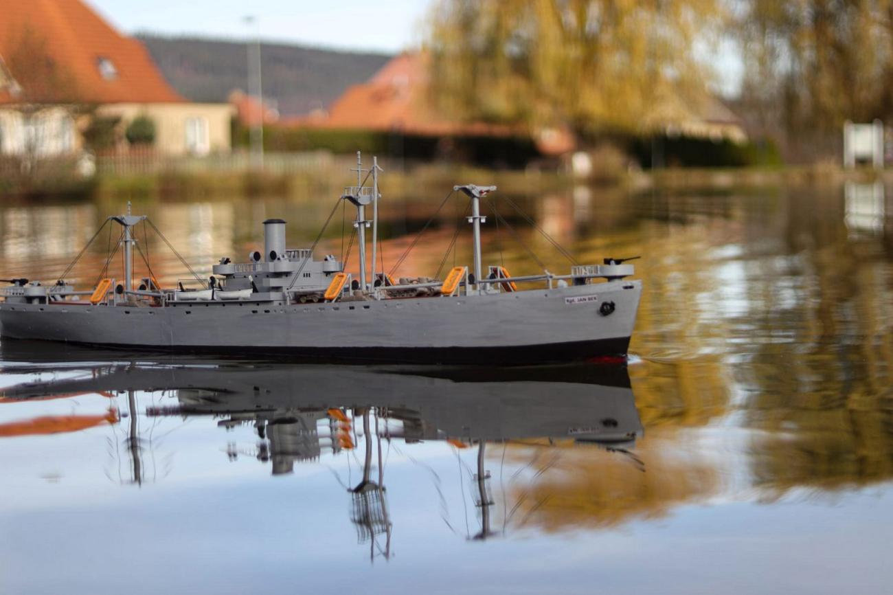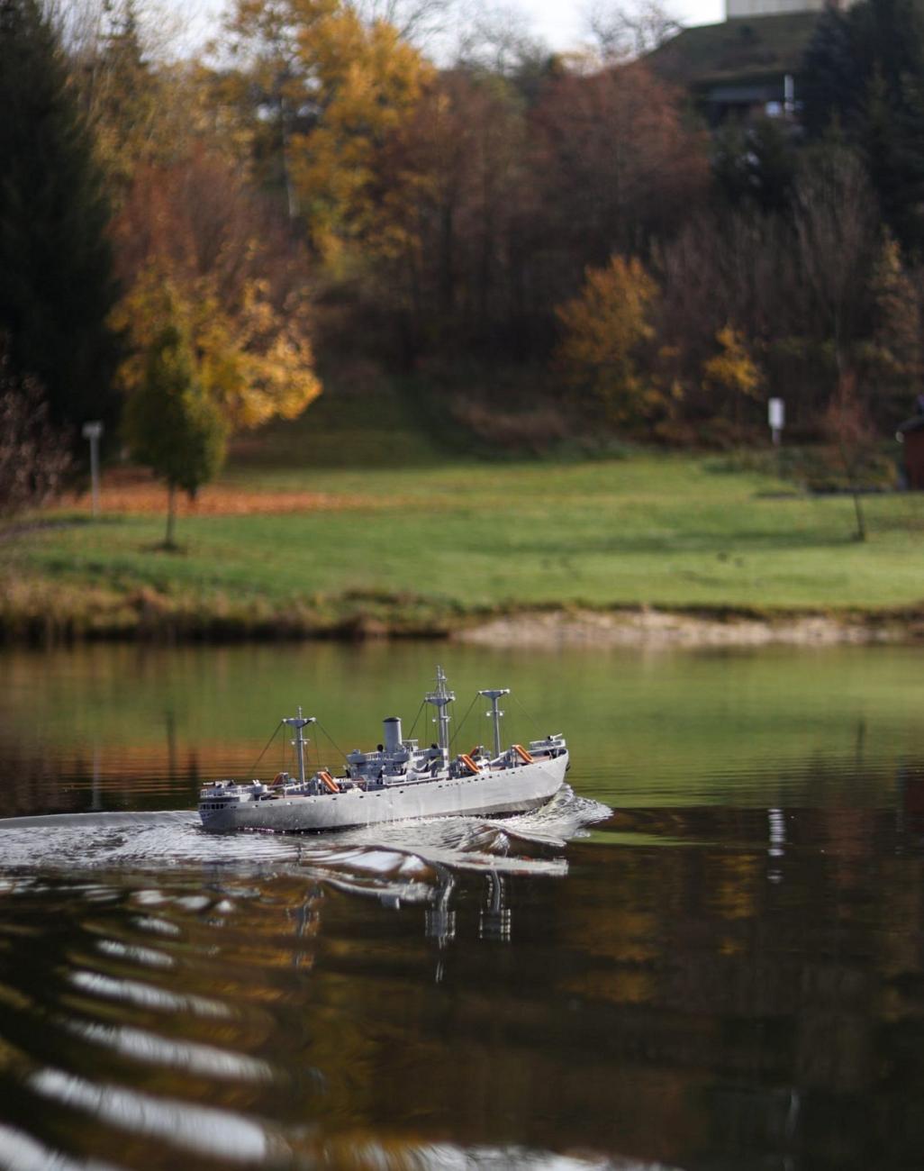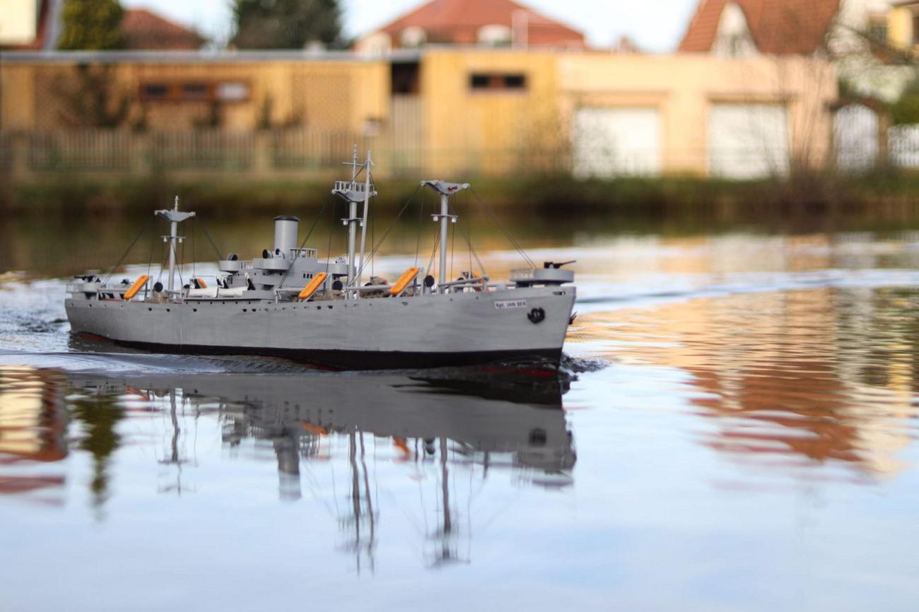Po těchto stavebních krocích jsem musel loď vyzkoušet. První plavba proběhla na malém schovaném rybníčku u nás ve městě. K mojí škodě jsem tam byl sám. Fotit a kormidlovat mi dohromady moc nešlo. Při této zkoušce ještě byla osazena vrtule o průměru 40 mm od Graupnera. Elektromotor byl bez problému, stejně tak regulátor a zdroj, olověná gelovka 6 V/5 Ah. Plavba vpřed a obraty tak jak by mohl druhoválečný nákladní parník mít. Byl jsem nadšen, jako skutečná, jen při reverzu je graupnerka slabší. Momentálně má model tištěnou, čtyřlistou vrtuli. Couvání je sní o dost lepší.