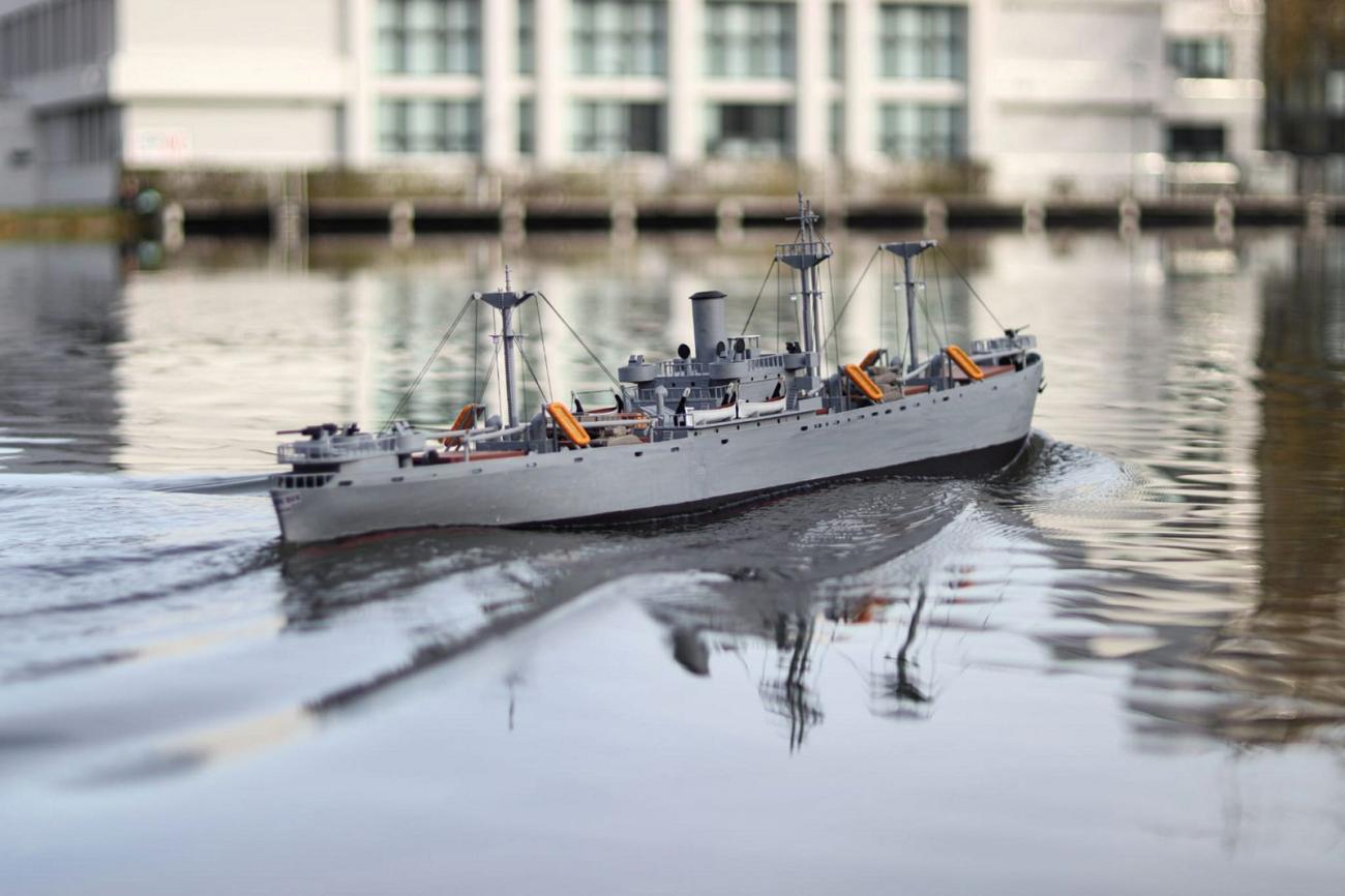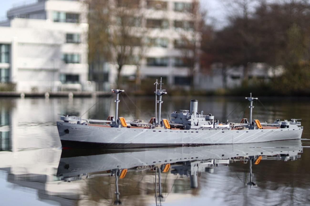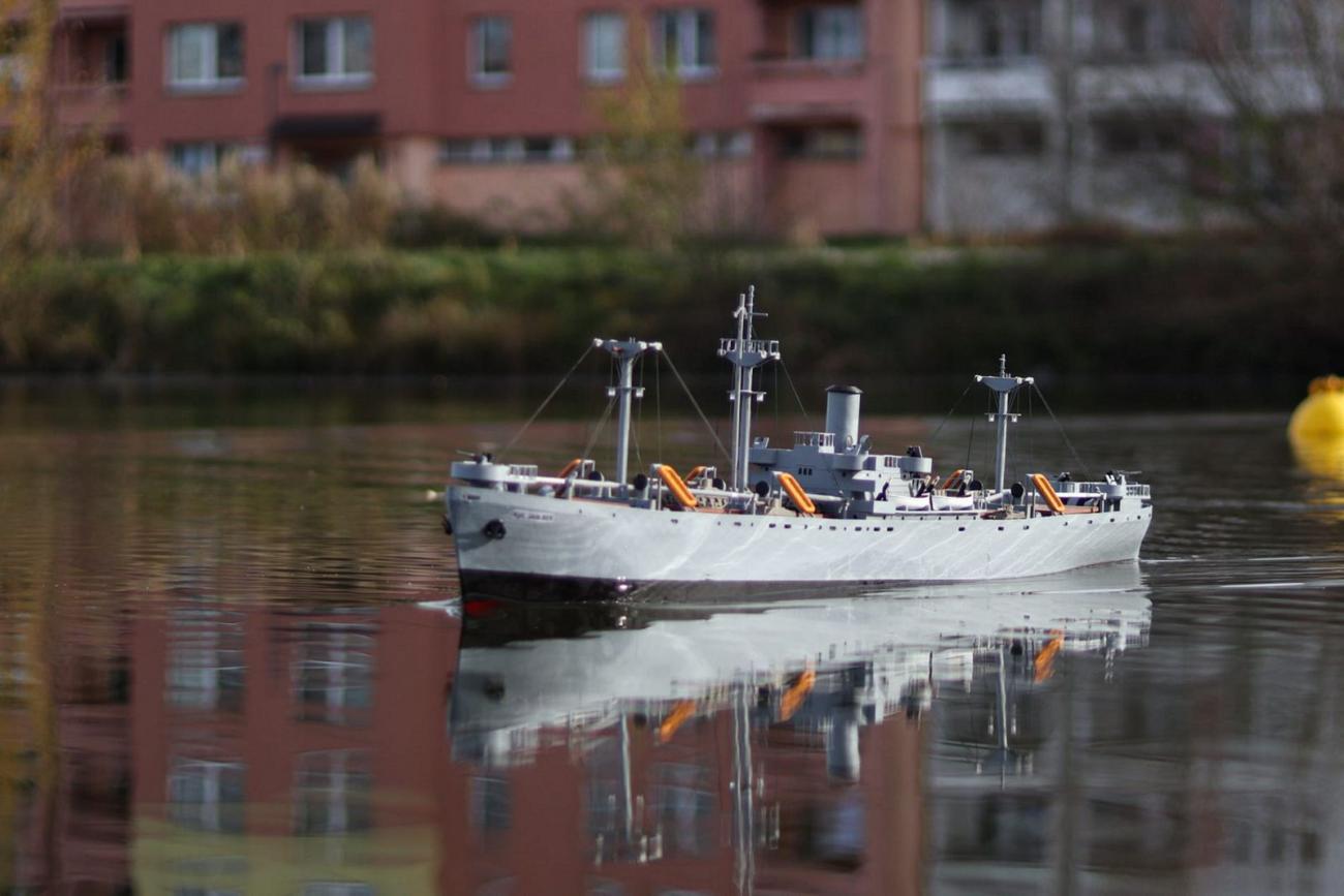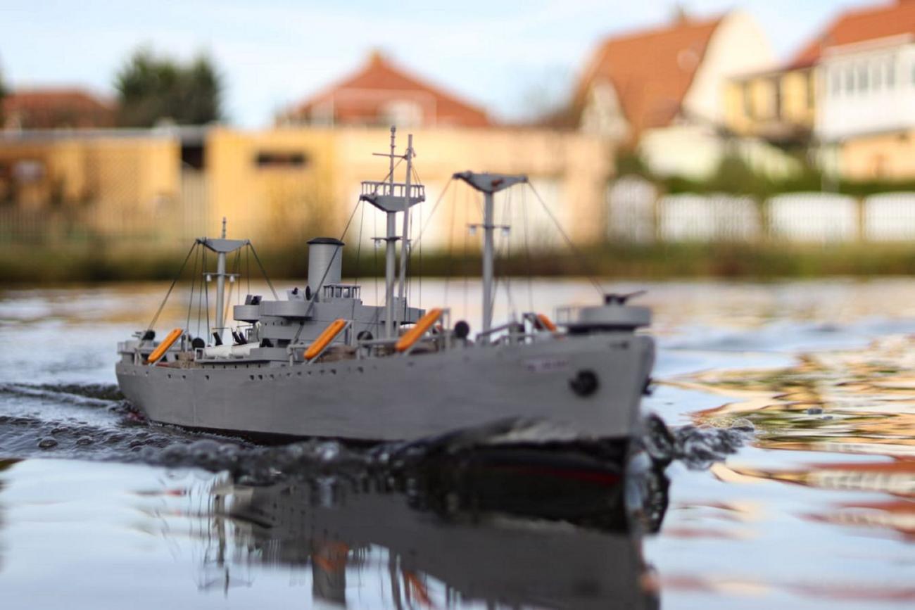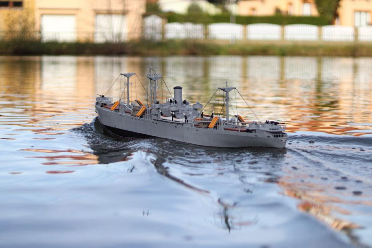 Po těchto stavebních krocích jsem musel loď vyzkoušet. První plavba proběhla na malém schovaném rybníčku u nás ve městě. K mojí škodě jsem tam byl sám. Fotit a kormidlovat mi dohromady moc nešlo. Při této zkoušce ještě byla osazena vrtule o průměru 40 mm od Graupnera. Elektromotor byl bez problému, stejně tak regulátor a zdroj, olověná gelovka 6 V/5 Ah. Plavba vpřed a obraty tak jak by mohl druhoválečný nákladní parník mít. Byl jsem nadšen, jako skutečná, jen při reverzu je graupnerka slabší. Momentálně má model tištěnou, čtyřlistou vrtuli. Couvání je sní o dost lepší.