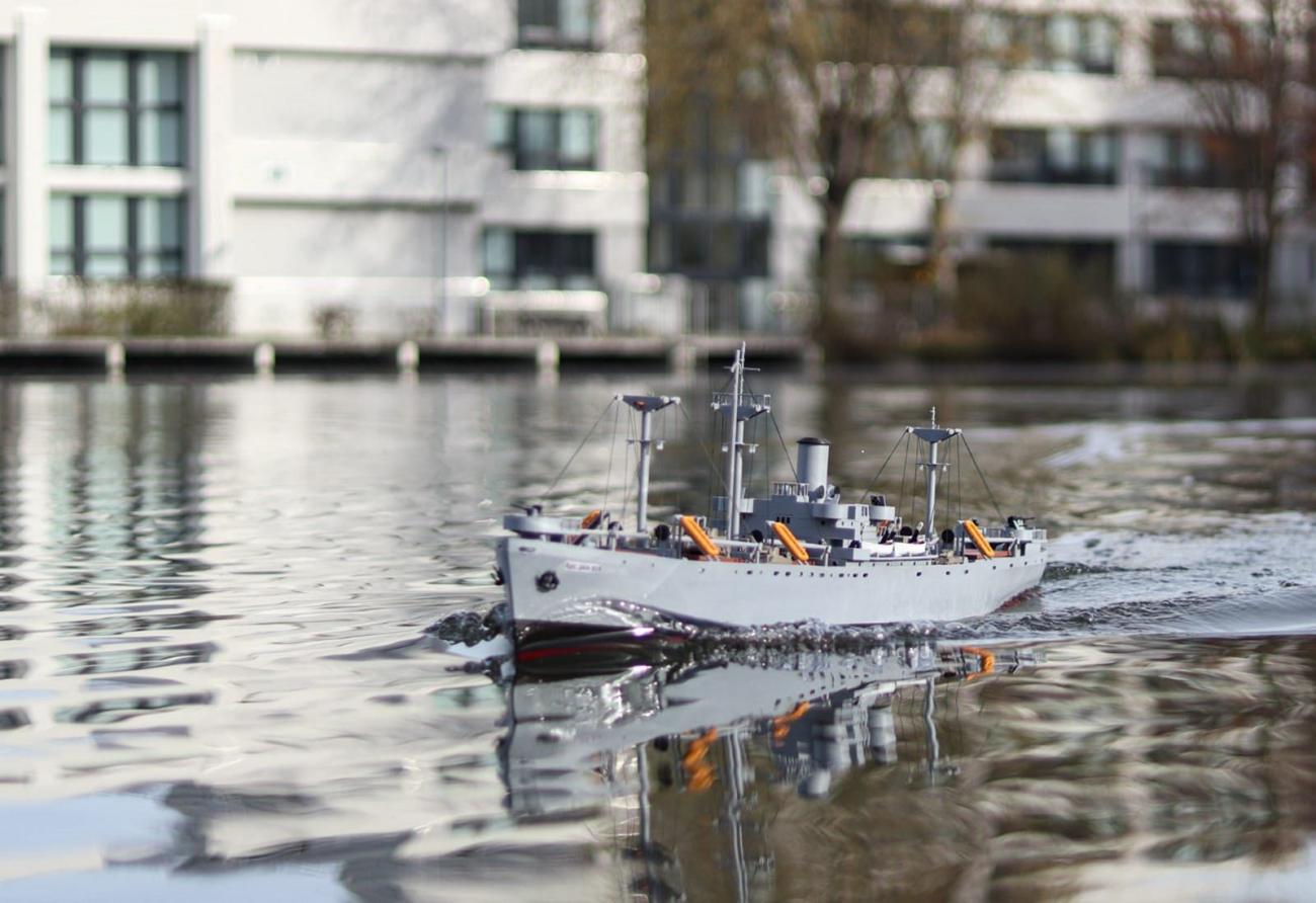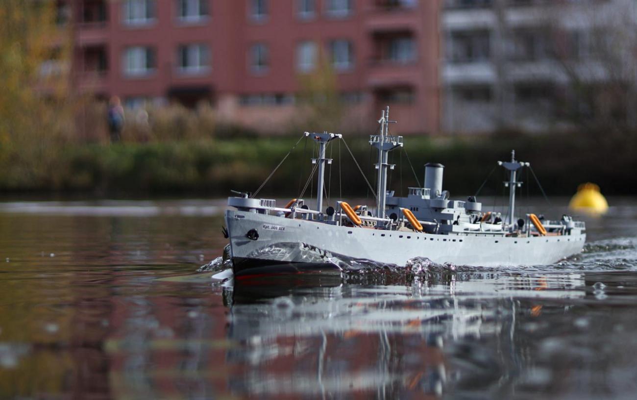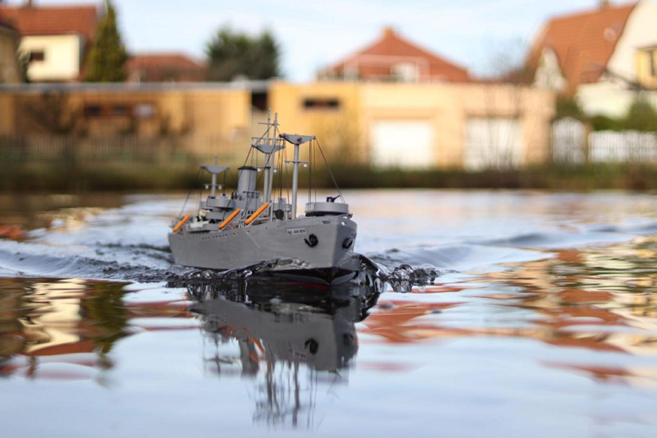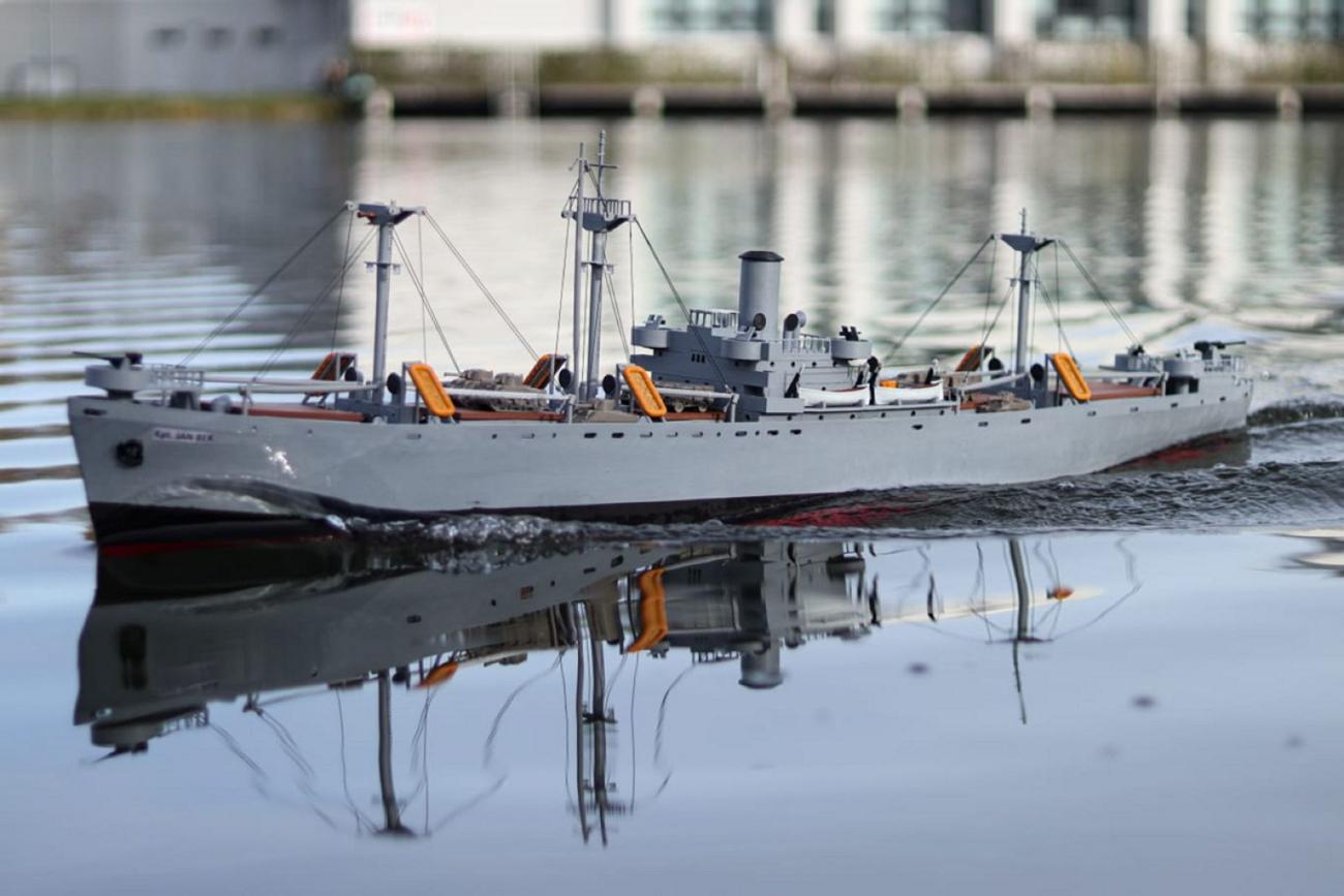 Po těchto stavebních krocích jsem musel loď vyzkoušet. První plavba proběhla na malém schovaném rybníčku u nás ve městě. K mojí škodě jsem tam byl sám. Fotit a kormidlovat mi dohromady moc nešlo. Při této zkoušce ještě byla osazena vrtule o průměru 40 mm od Graupnera. Elektromotor byl bez problému, stejně tak regulátor a zdroj, olověná gelovka 6 V/5 Ah. Plavba vpřed a obraty tak jak by mohl druhoválečný nákladní parník mít. Byl jsem nadšen, jako skutečná, jen při reverzu je graupnerka slabší. Momentálně má model tištěnou, čtyřlistou vrtuli. Couvání je sní o dost lepší.