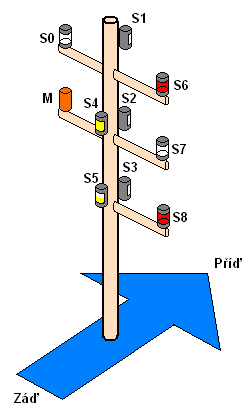 kařdé s jednou svítilnou. Na levoboku jsou dvě ramena. Horní má svítilnu a spodní oranžový majáček. Poziční červené a zelené