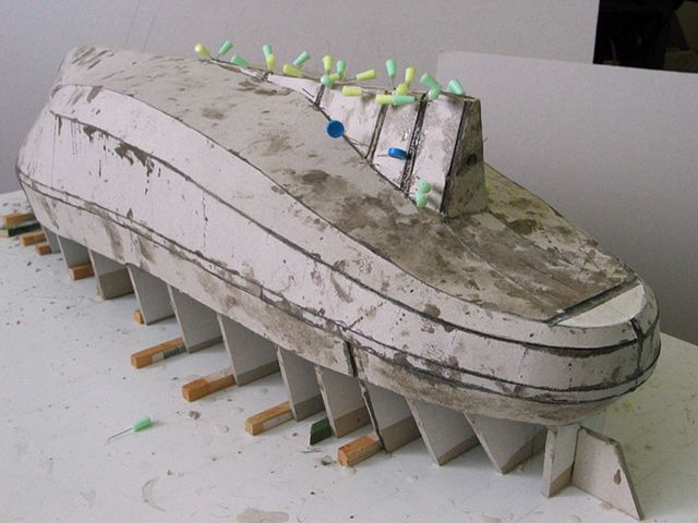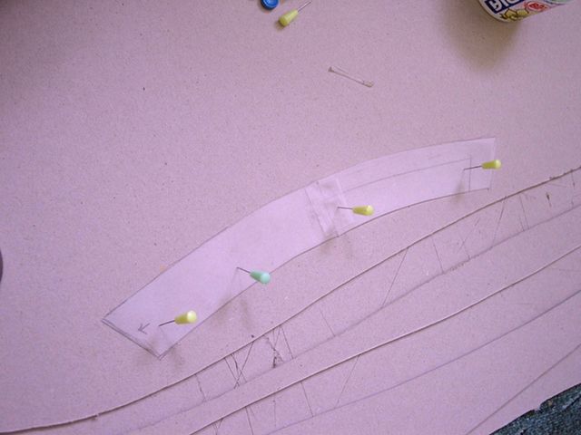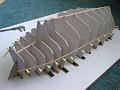 podél trupu a zajistil špendlíky. Díky navlhčení šla zhotovit i kulatá příď ze dvou dílů. Po vyschnutí jsem díl sejmul, měl již požadovaný