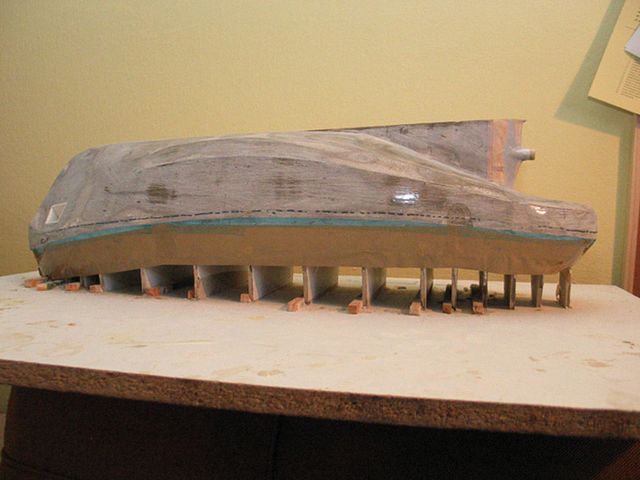 V tomto stádiu jsem k trupu přilepil boční kýl a olaminoval. Po vytvrzení obrousil a celý trup vytmelil