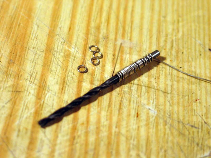 průvlaků. Lemovací kroužky jsem zhotovil z drátu, který jsem omotal okolo vrtáku a nastříhal kleštičkami. Kroužky jsem pak spájel a začistil. Dobře posloužila pájecí tekutina. Očka