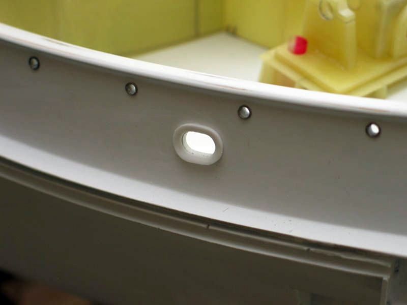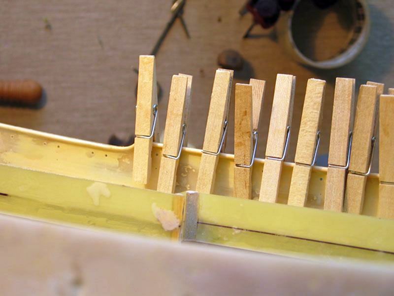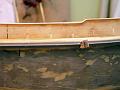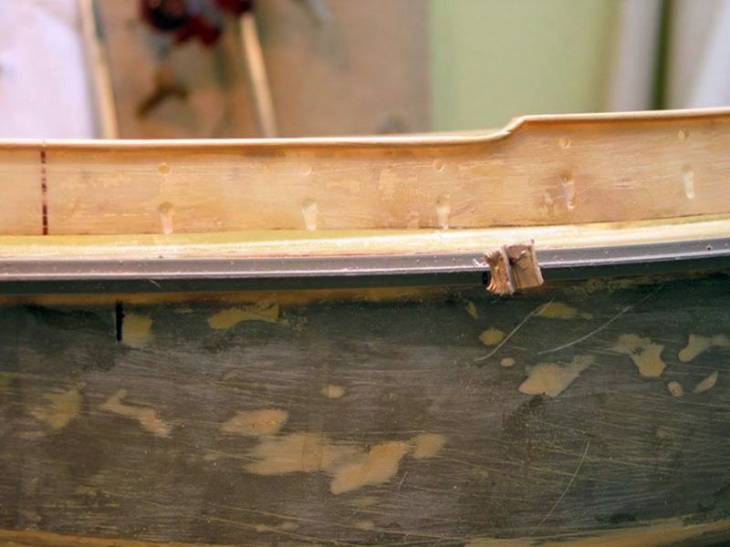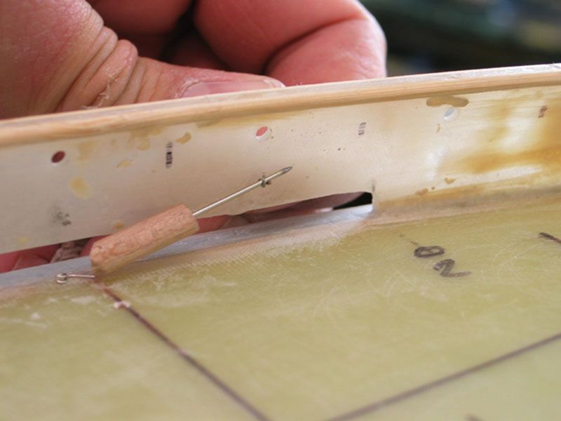 bortu. Použil jsem bambusové špejle z rolet. Pomocí přípravku jsem je obrousil tak, abych dostal nosník o půlkulatém profilu. Ten jsem pak nalepil okolo bortu. Probrousil jsem otvory