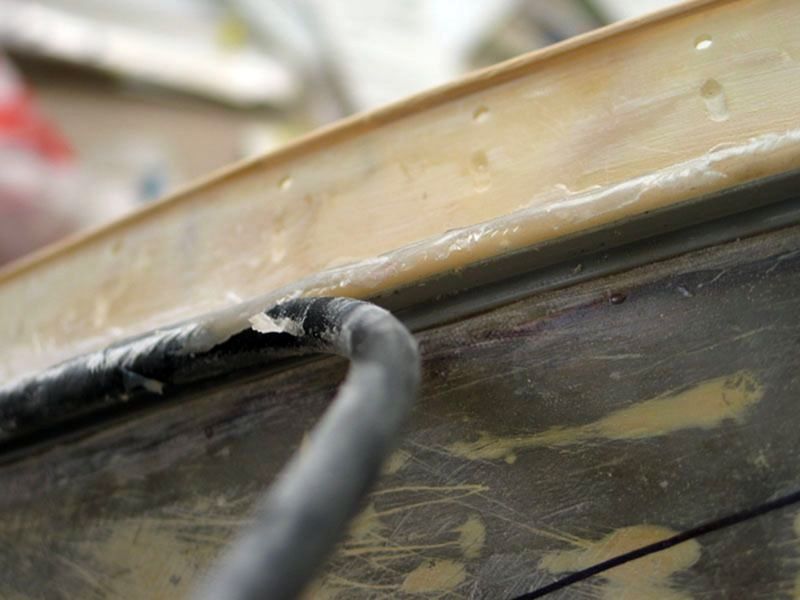 vazelínou a umístil na T-profil. Připravil jsem si 1200ku a pásky tkaniny - 35 g. Gumový profil jsem potřel epoxydem a přiložil tkaninu. Opět potřel epoxydem, tím sem ovšem moc