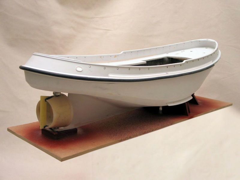 šablony jsem tvar přenesl na laminátovou desku 0,7 mm. Tvar jsem vystřihl nůžkami a dopiloval. Počítal jsem i z otvorem pro vlepení domečku v kterém je ukryt mechanizmus kormidla, jak u